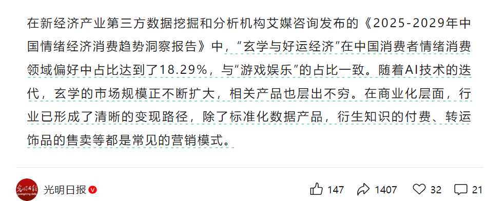 据艾媒咨询最新数据显示,国内18.29%的消费者对玄学及相关产品有消费偏好,其中18-30岁Z世代占比超70%,而这部分人群,正是AI算命骗局的核心目标群体。