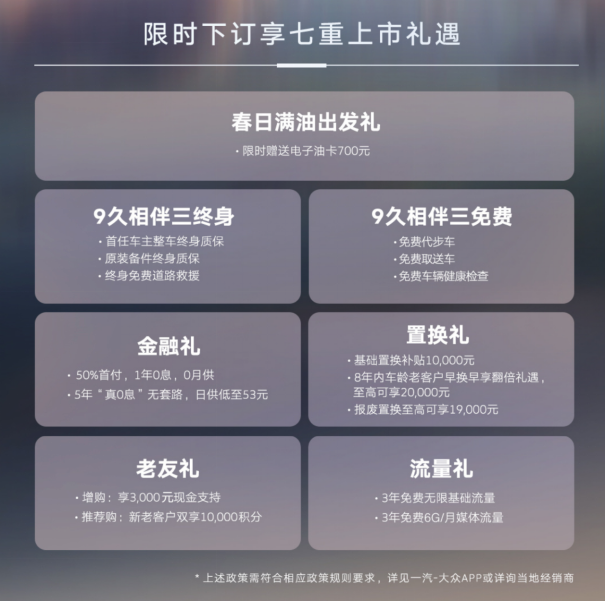 价格层面,全新揽巡的上市策略可谓"一步到位":四驱至尊版定价24.69万元,四驱旗舰版定价26.69万元,直接击穿同级合资及豪华品牌SUV的价格防线。与此同时,限时下订可享七重上市礼遇:春日满油出发礼赠送700元电子油卡;9久相伴三终身覆盖首任车主整车终身质保、原装备件终身质保及终身免费道路救援;9久相伴三免费提供免费代步车、免费取送车、免费车辆健康检查。金融方案极其灵活----50%首付享1年0息0月供,另有5年"真0息"无套路方案,日供低至53元。针对置换用户,基础补贴10000元,8年内车龄老客户更可享至高20000元翻倍礼遇,报废置换至高可享19000元。此外,老友礼(增购享3000元现金,推荐购新老客户双享10000积分)与流量礼(3年免费无限基础流量+3年每月6G媒体流量)让从购车到用车的全周期都充满惊喜。