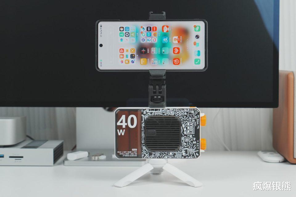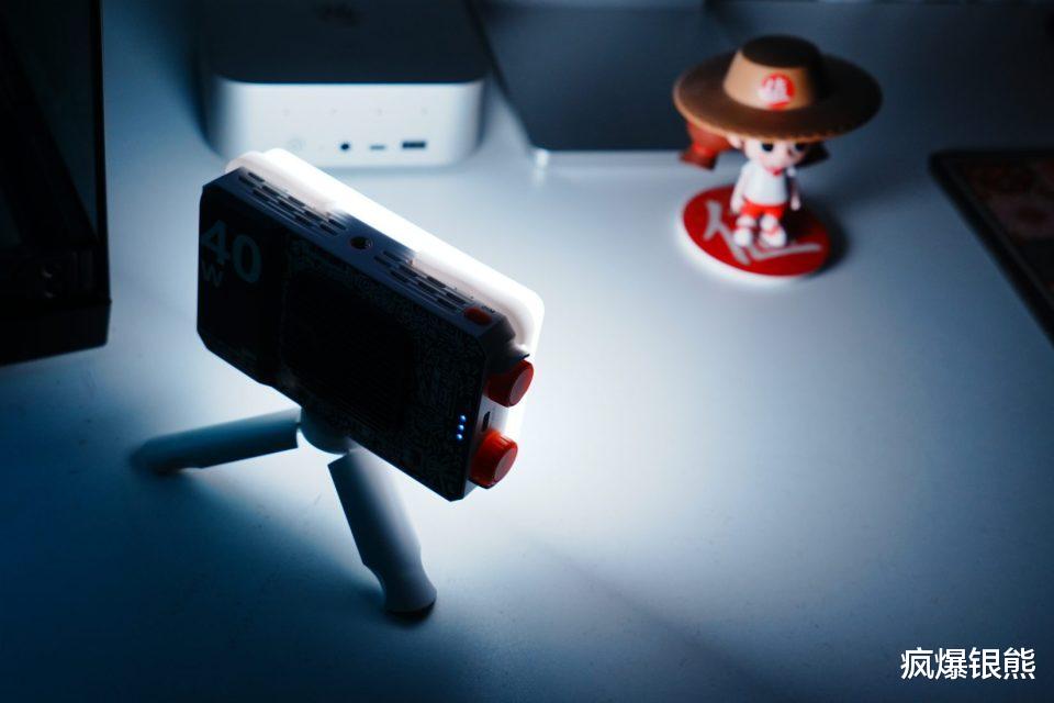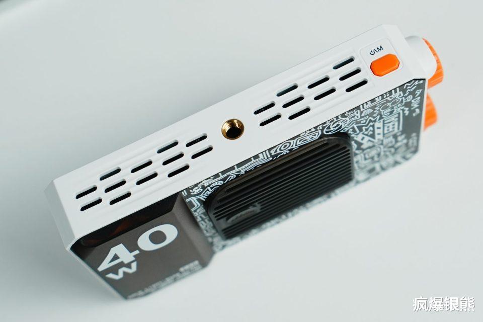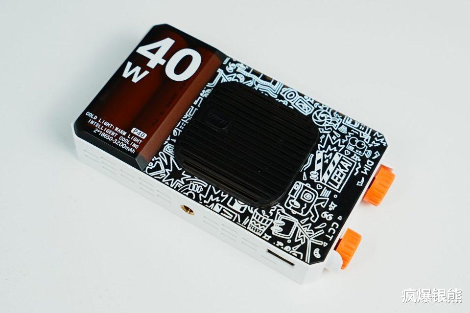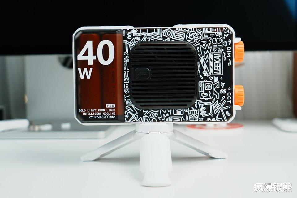 重点聊一下这款补光灯,背面设计很出彩,白色线条风简笔画堆叠有种赛博朋克的风味,右侧40W超大字符代表了其最高输出功率。40W壳体采用半透明磨砂处理,能看到内部的两个18650锂电池。