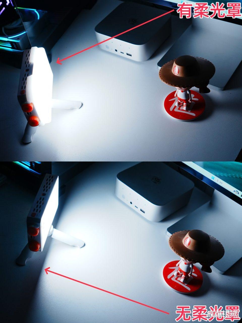 附带上柔光罩和不带柔光罩时,拍摄同一画面的对比情况,带上柔光罩后拍出来的照片光线没那么直。