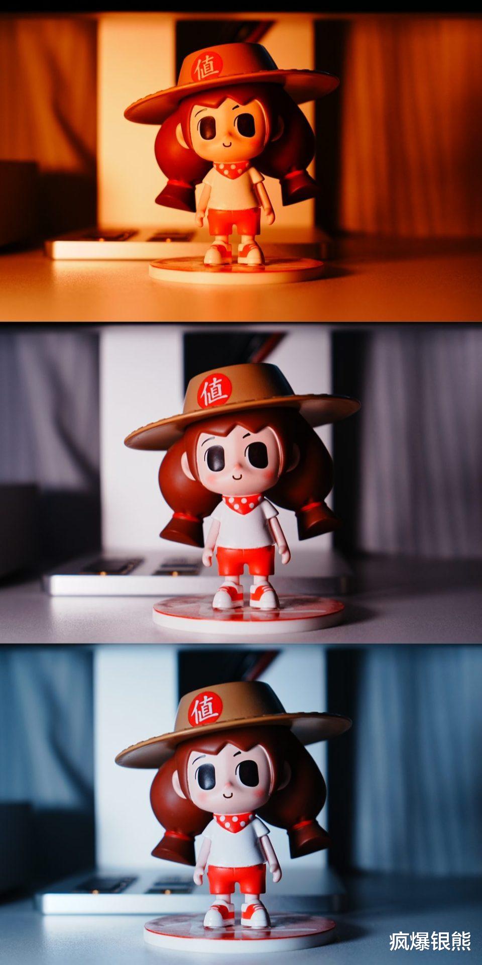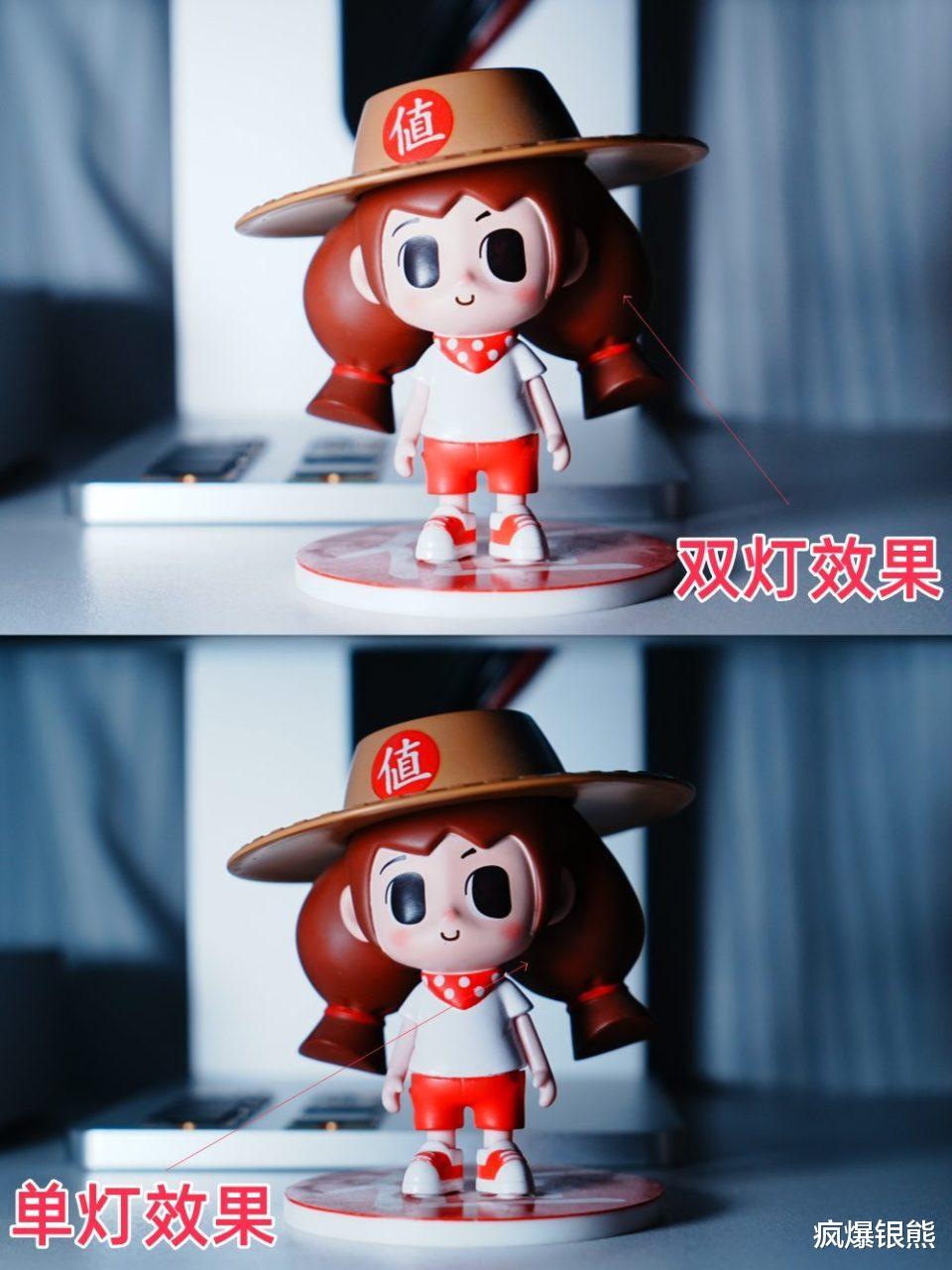 上面是双灯和单灯下拍摄小摆件的效果,明显双灯右侧头发更清晰一些,底部的阴影感也更弱。