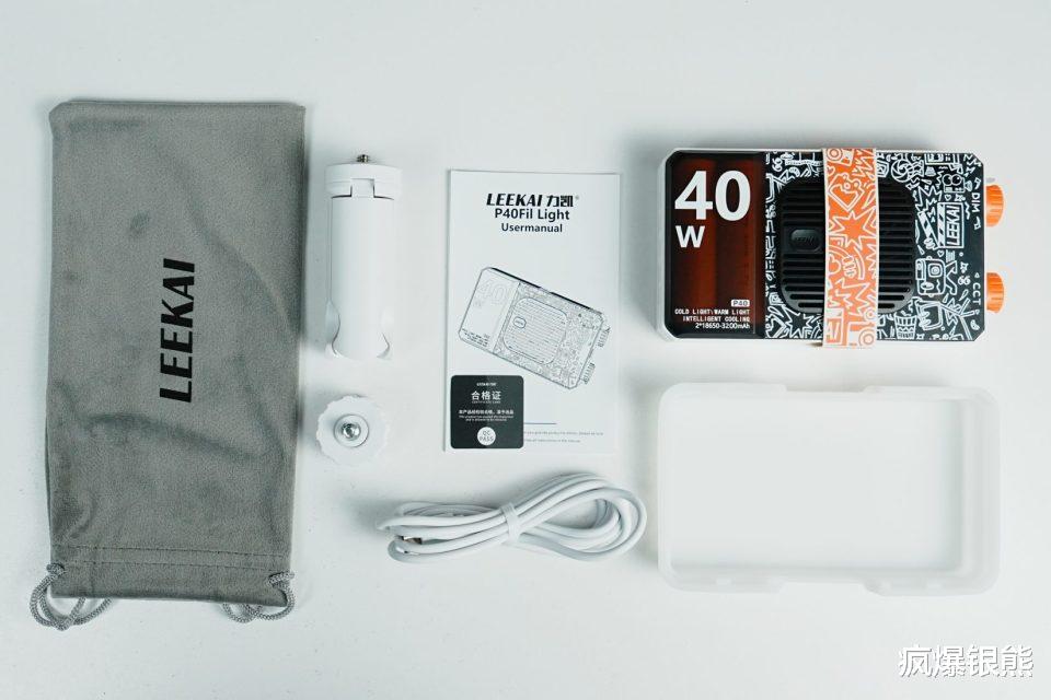 力凯P40掌上补光灯内部配件如上图,除了颜值在线的补光灯外,还有柔光罩一个,充电线一根,说明书一本,二合一手柄一个,冷靴转四分之一螺丝一个,绒布收纳袋一个,可玩性蛮高。