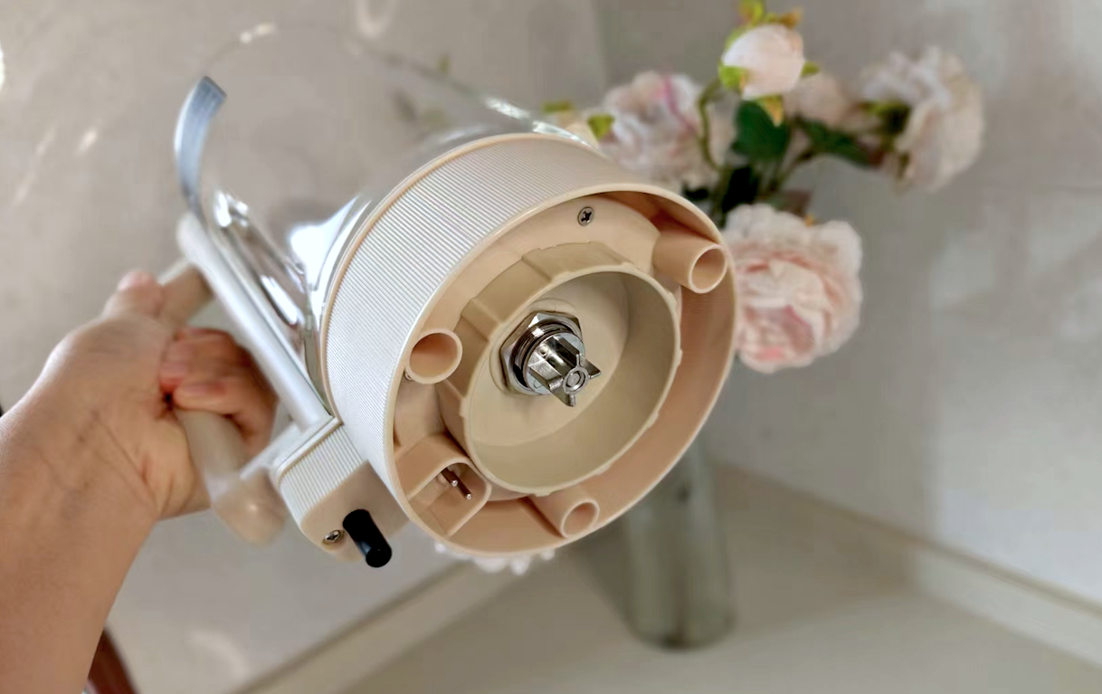 以前用的破壁机,电机基本都设计在搅拌杯底部,使得本来就重的搅拌杯在装完食材和水之后拿起来很费劲,而这次特地针对这一点做了升级,将电机放在了底座中,这样杯体拿取轻便多了。