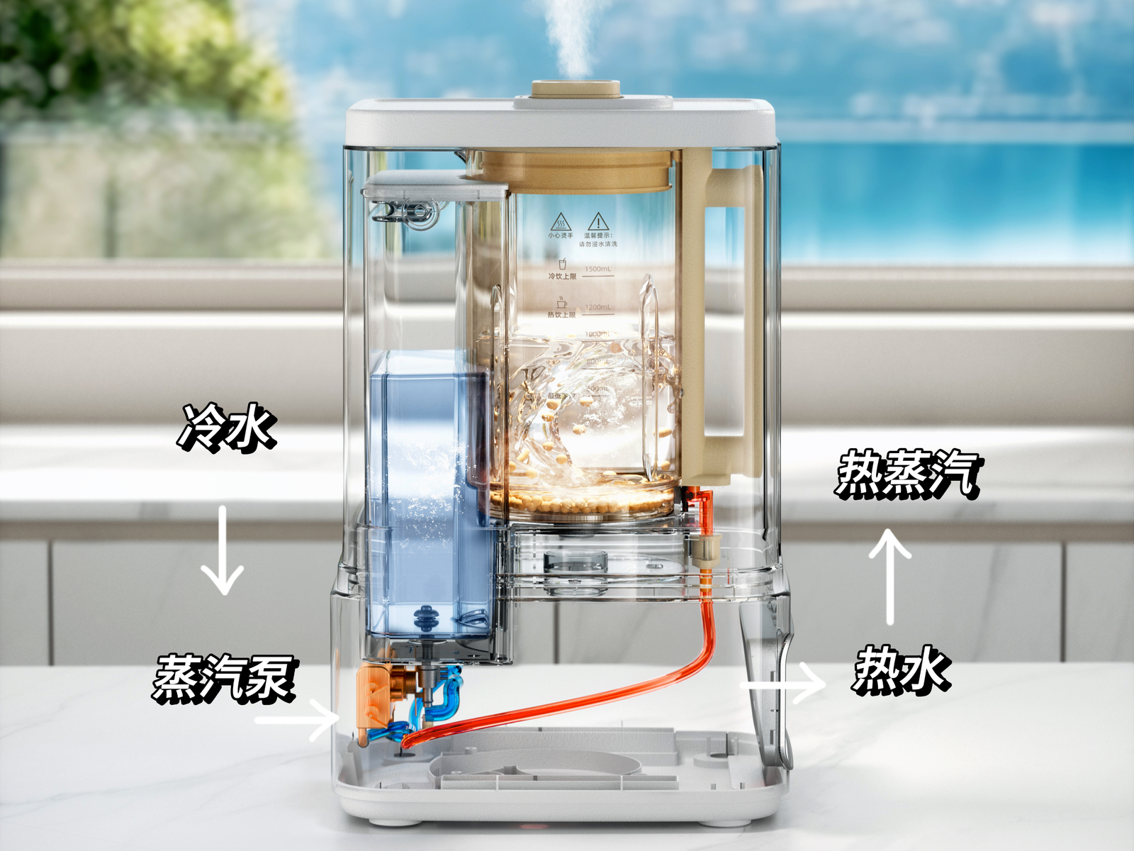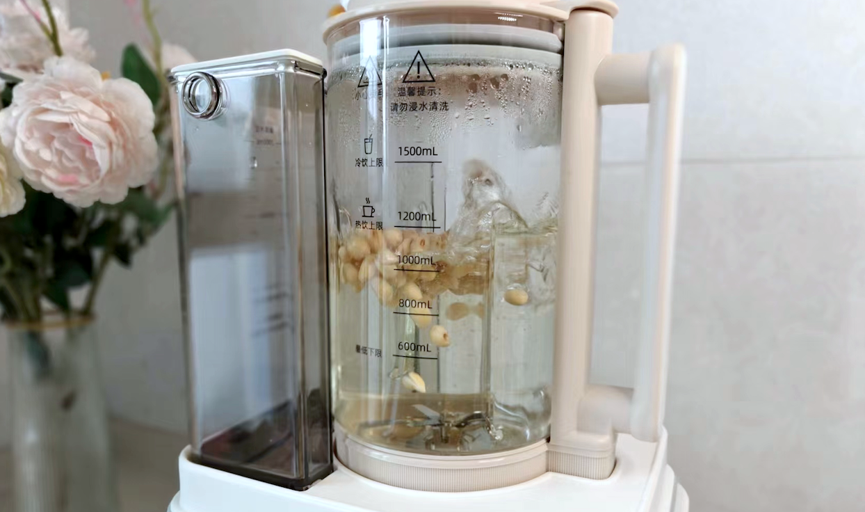 水箱容量2L,加一次水烹饪和清洗都够用,根本不需要频繁加水。搅拌杯热饮上限1200ml,冷饮上限1500ml,可以满足3-5口之家使用。