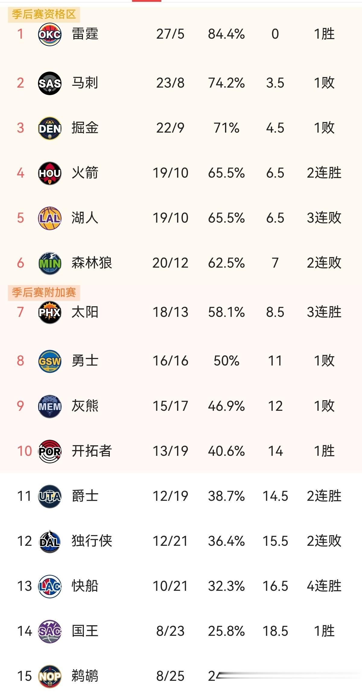 今日比赛结束后,西部最新排名如下(湖人队比赛刚结束,官方还未更新):
