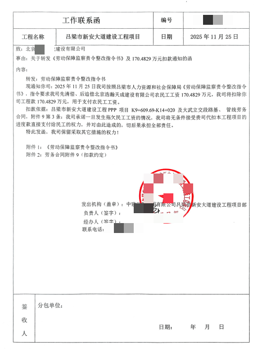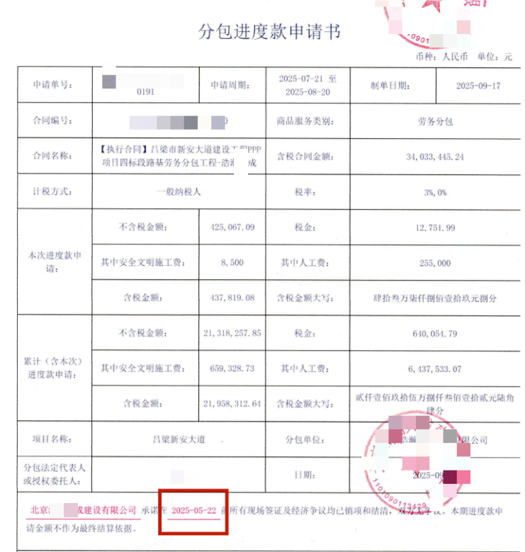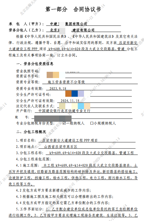 据了解,吕梁市新安大道建设工程PPP项目是当地重点基础设施工程,2023年5月,浩某天成通过合法流程中标该项目路基、管线劳务分包工程,并于2023年7月与某建某局正式签订《劳务分包合同》,合同总价3400余万元,约定工期180天。合同签订后,浩某天成严格按照约定组织人员、设备进场施工,全力保障项目进度,期间投入大量人力、物力,保质保量完成施工任务。