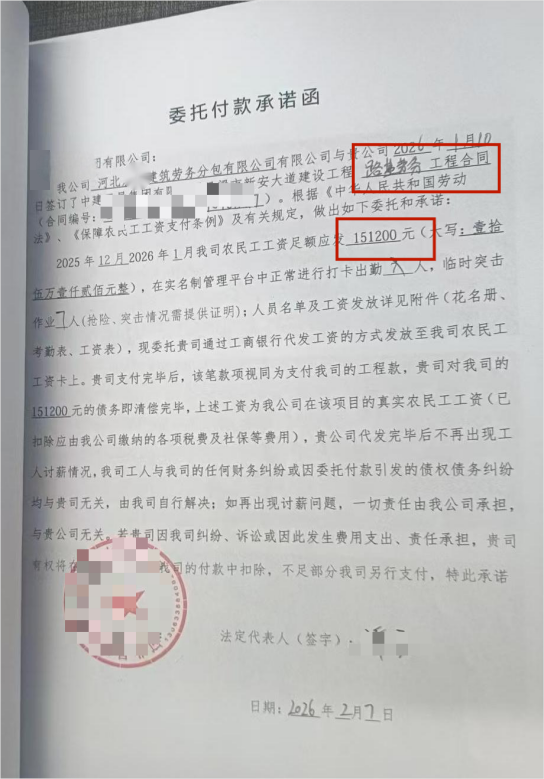 截至2025年8月20日,根据双方结算单合同内剩余未付金额,以及浩某天成合同外工程的实际支出总计欠付1411万元,直至2026年2月,浩某天成方才得知切割了工作面,和河北某平建筑劳务分包公司签署合同,形成“一女二嫁”的混乱局面。此时项目早已停工,浩某天成多次派员前往项目部沟通结算、付款事宜,某建某局相关人员以“再等等、等到小年”等为由,一再拖延处理。在以发放农民工工资的名义扣款后,仍致使多名农民工直至春节前仍未拿到应得工资。