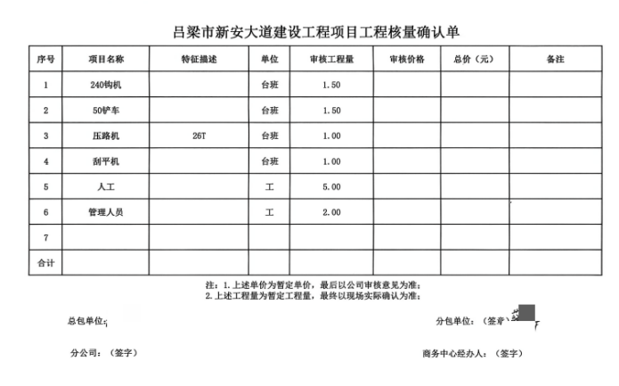 (工程项目确认单,当事人提供)
