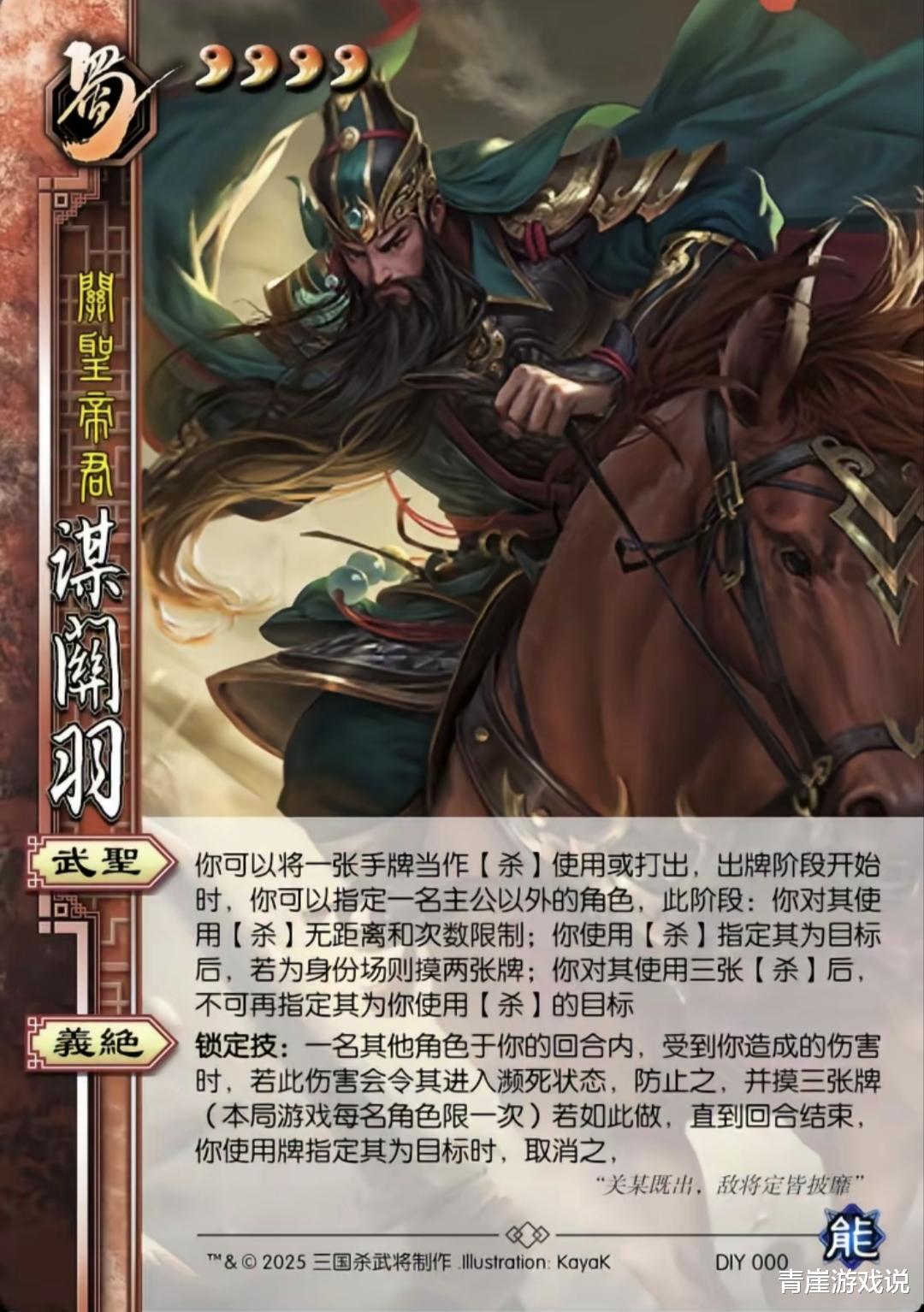 谋关羽也是烂中烂的代表作之一,为了体现“忠义”【武圣】不能对主公发动就算了,发动【武圣】放弃大脑三刀+过牌就算了。那请问【义绝】又是什么意思?强行放对面一马,可以猜到是设计师限制强度刻意为之,那【武圣】又为什么要设计高数值,这样矛盾冲突的设计意义在哪?