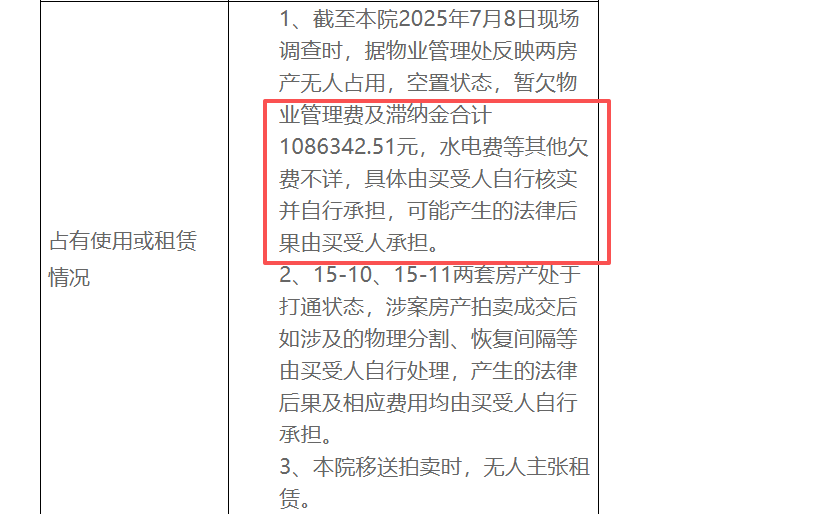 这本是一场正常的法拍,但真正让这笔交易“出圈”的,是法院公告中明确提醒的一条信息:截至2025年7月,该房产暂欠物业管理费及滞纳金合计 1,086,342.51元(约108.6万元),且这笔费用需由买受人(即竞拍成功的人)自行核实并承担 。这意味着,即便以起拍价成交,买受人的实际成本也将从192万飙升至300万以上,几乎抹平了“捡漏”空间。