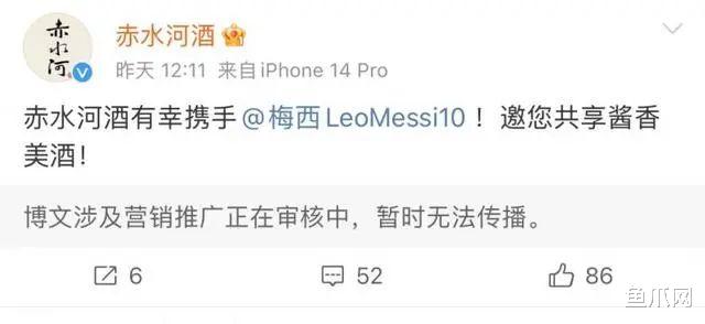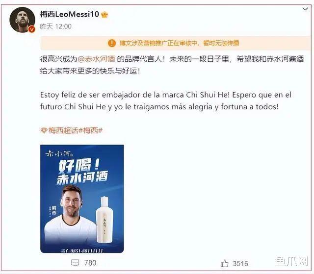 中国人爱喝酒,特别是白酒,这是全世界都知道的事儿。比较知名的白酒企业几乎是用不着代言人的,但是随着如今年轻消费者的不断涌现,不少酒企也开始考虑选择代言人来扩大品牌宣传了。如何让自己的代言人受到绝大多数年轻朋友们的喜爱呢?现在偶像塌房的多,老艺术家在年轻群体中又没有号召力,不如选择运动员吧!就这样,财大气粗的中国白酒企业盯上了一个人。梅西代言中国白酒8月1日,足球巨星梅西在社交平台发布消息称,很高兴成为赤水河酒的代言人。这条简短的消息引发无数粉丝和媒体的热议。有网友质疑该消息的真假,称梅西在国外其他社交平台的官方账号并未同步该代言。但也有网友表示,梅西作为世界足坛巨星选择中国白酒品牌,成为赤水河酒的代言人,这是一个令人振奋的消息!随后,赤水河酒官方账号回应,梅西本人知晓代言一事,且后续还会为其拍摄广告。