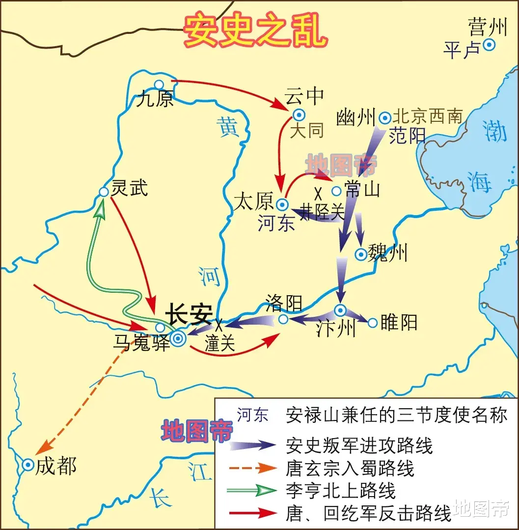755年(唐玄宗天宝十四年)十一月,范阳、平卢、河东三镇节度使安禄山,在范阳(今北京)起兵,安史之乱爆发。