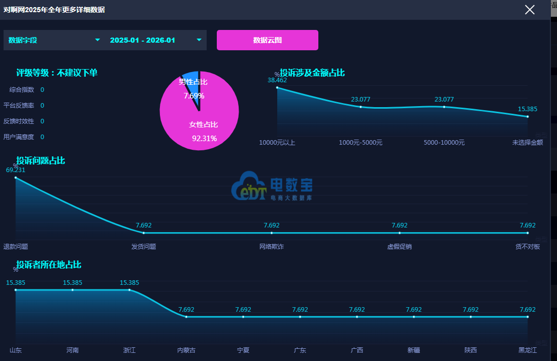 据网经社旗下电商大数据库“电数宝”监测数据显示,对啊网2025年至今投诉的问题主要包括退款问题、发货问题等,其中退款问题占比最高,达到了约69.2%。