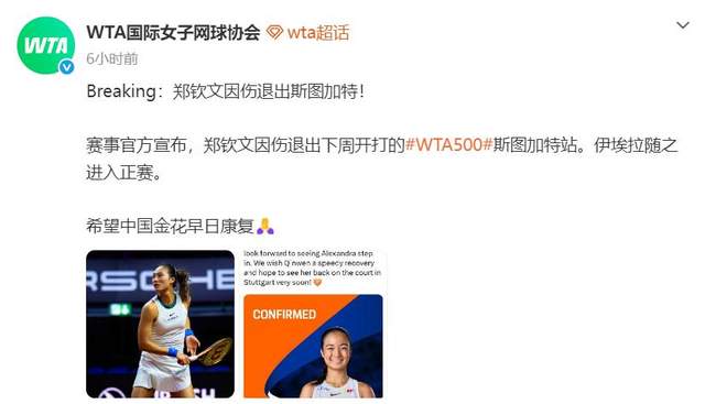 北京时间4月8日凌晨,WTA官方突然发布了一条消息,郑钦文因伤退出了下周开打的斯图加特站比赛。这也意味着她原本计划中的红土赛季首秀,只能往后推了。替补她参赛的,是世界排名第46位的菲律宾选手伊埃拉。