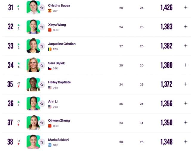郑钦文本赛季打打停停,直接后果就是世界排名一路往下掉。WTA最新一期排名显示,她已经从赛季初的第23位降到了第37位。更扎心的是,王欣瑜升到了第32位,已经超越郑钦文成了新的中国一姐。