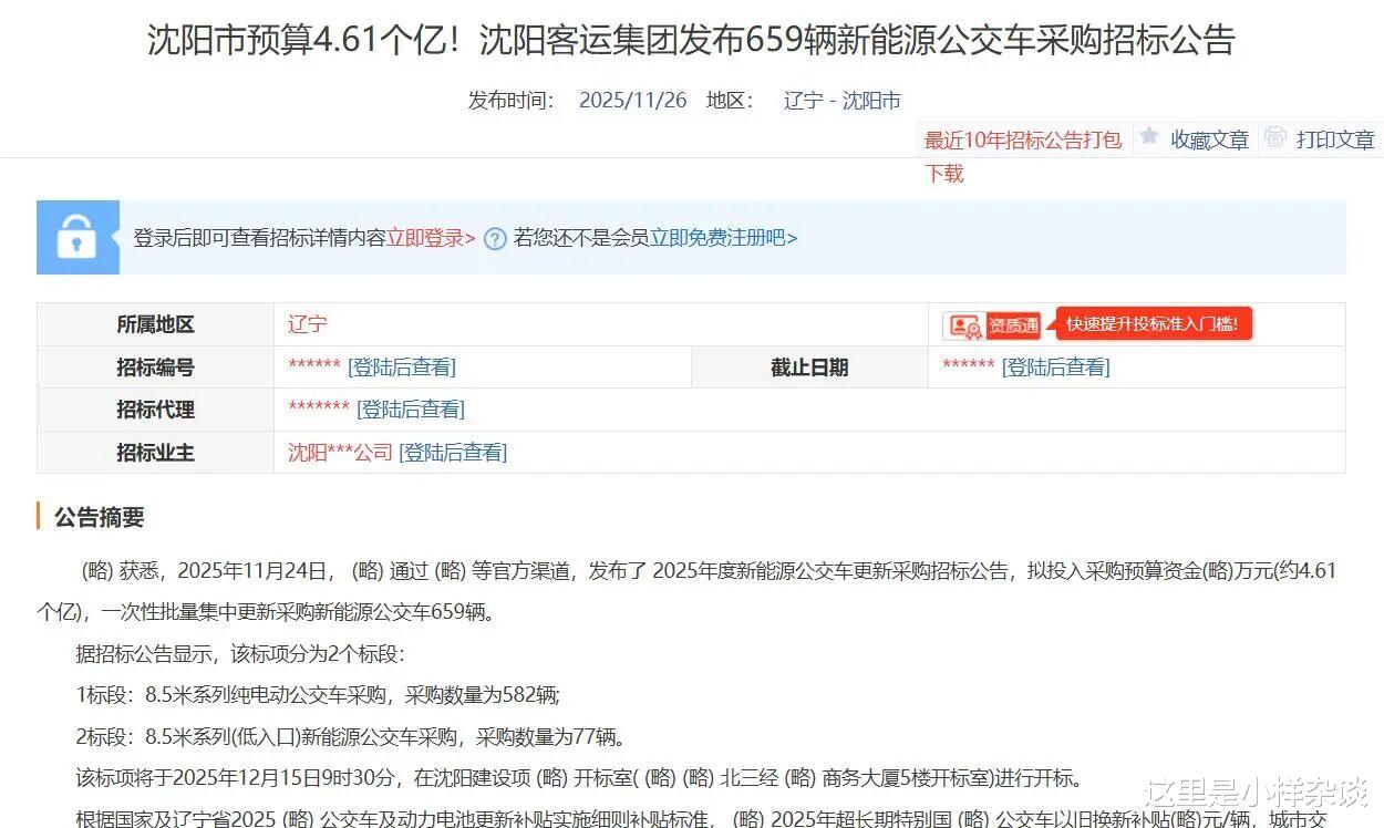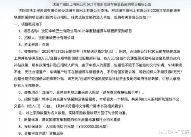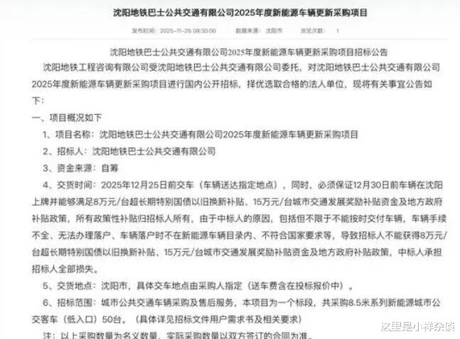 客运集团的开标日期是12月15日,地铁集团的是12月17日,而交货时间就很统一了,2025年12月25日前,你没看错,就十天的时间。而且必须保证12月30日前车辆在沈阳上牌并能够满足8万元/台超长期国债以旧换新补贴,15万元/台城市交通发展奖励补贴资金及地方补贴政策。这么短的时间内交付将近800台公交车,没有几个厂家可以完成吧。或许都能猜出来会是哪家中标了。这个超短的时间,让人不得不猜测,这些车都已经生产出来了,是厂家原来的买家不要了,转手卖给其他人了。