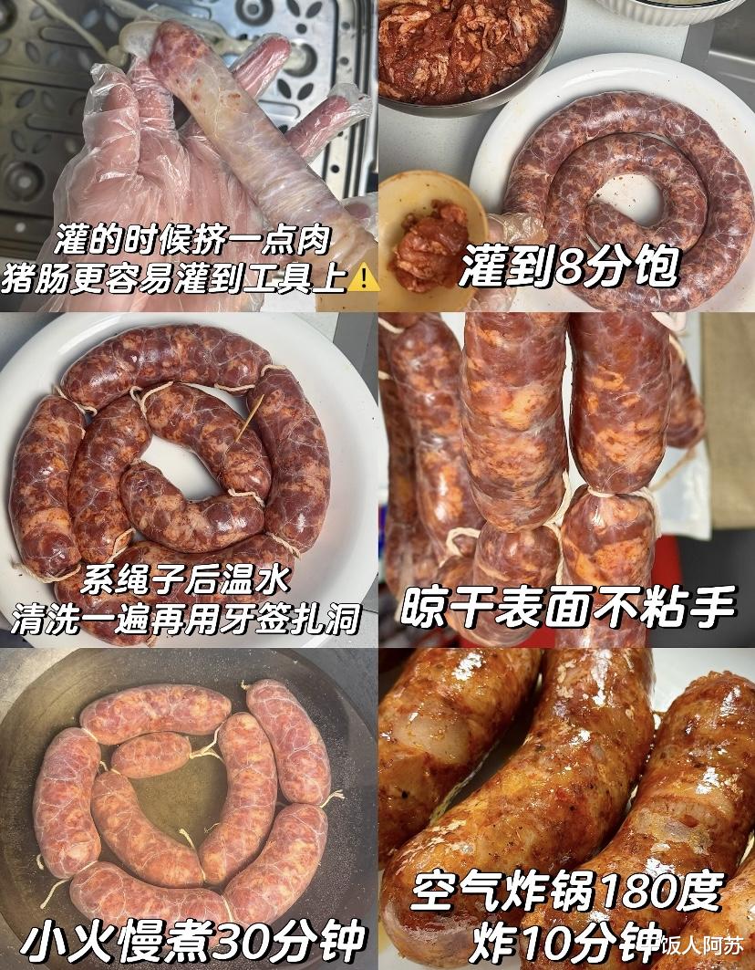 在腌肉的间隙,我们需要处理猪肠衣。买回来的盐渍肠衣需要用清水反复冲洗,洗去表面的盐分和杂质,直到水变清澈为止。洗净后的肠衣用清水浸泡一会儿,使其变软更有韧性。灌肠是整个过程最解压也最需要技巧的环节。将腌好的肉馅装入灌肠器,肠衣套在灌肠嘴上也同样重要,在套肠衣之前,先在出口处挤一点点肉馅出来,这样肠衣更容易滑上去,而且能避免空气进入。灌的时候要注意力度,肉馅灌到八分饱即可,千万不要贪多灌得太满,否则煮的时候肠衣容易爆裂。灌满后,用棉线将长条的香肠分段扎紧,形成我们熟悉的短香肠形状。