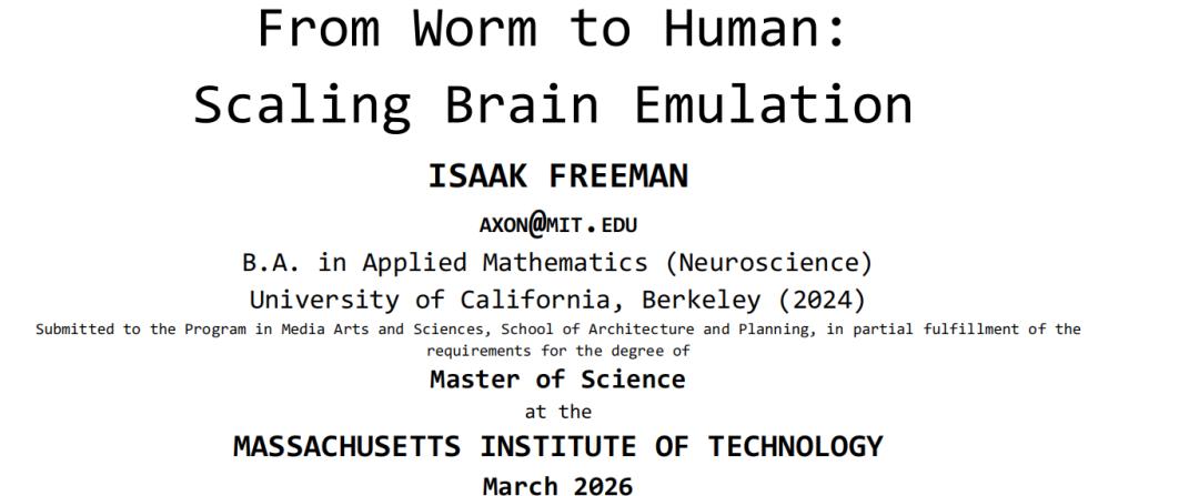 近日,美国麻省理工学院(MIT)研究生艾萨克·弗里曼(Isaak Freeman)和所在团队写了一篇长达 100 多页的论文,标题是《从蠕虫到人类:大脑仿真如何规模化》。