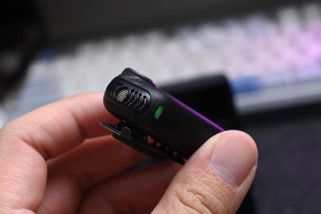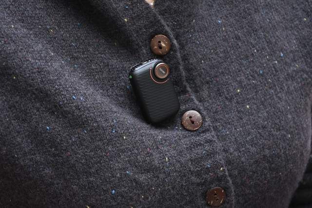 颜值和便携性也值得夸,麦克风主体是黑色磨砂ABS材质,摸起来防滑又有质感,重量特别轻,夹在衣领上完全不压衣服,也不会让布料变形。
