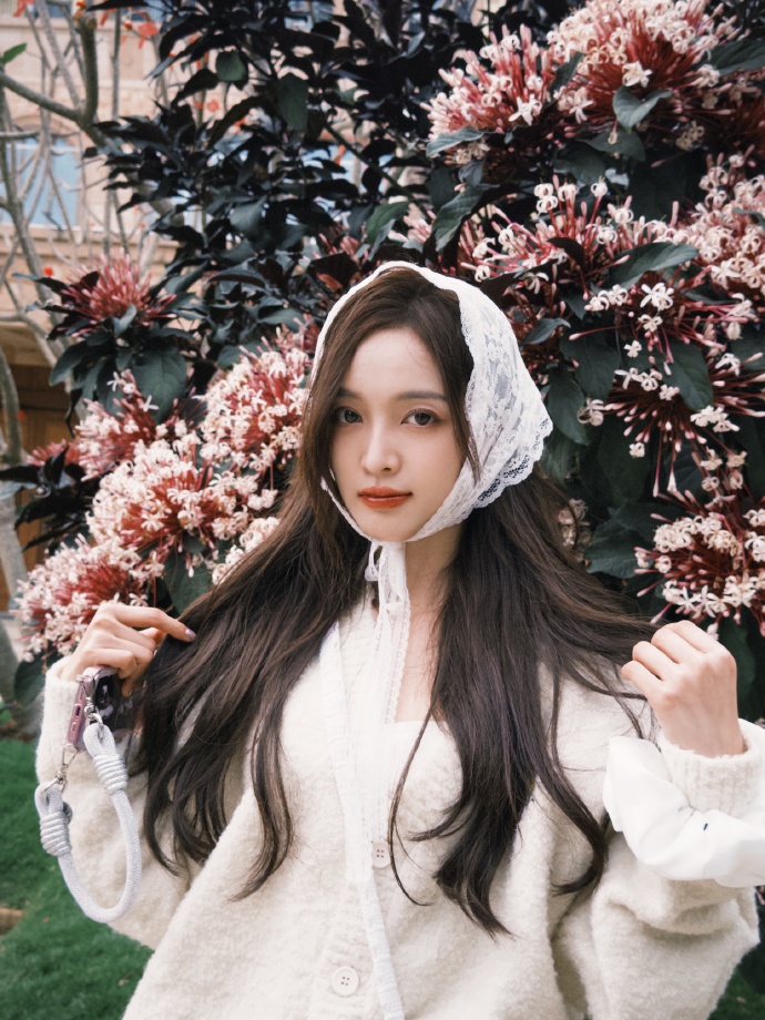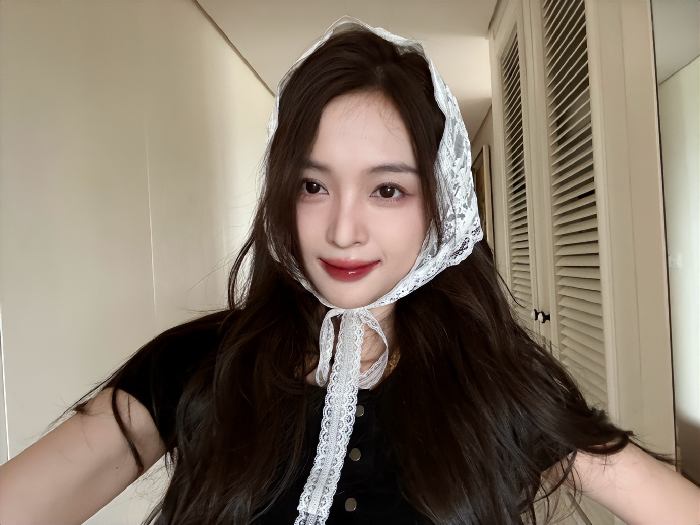 吴宣仪散发出迷人的微笑。这个角度展现了她的精致面庞和自然的妆容,散发出不加修饰的清新魅力。她依旧佩戴着那顶蕾丝帽,这种简单却极具温柔感的造型,给人一种舒适和亲近感。她那双大眼睛和灿烂笑容仿佛能瞬间让人忘却所有烦恼,直击心灵深处。