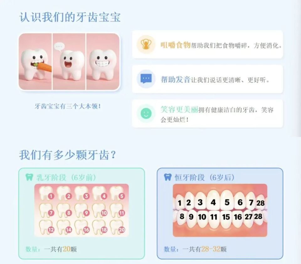 虽然牙齿宝宝看起来坚硬,其实也很娇嫩,需要我们的细心呵护。它们分为露在外面的牙冠和像树根一样深埋固定的牙根。小朋友在6岁前拥有20颗乳牙,之后会逐渐换上28-32颗恒牙——这些恒牙将陪伴我们一生,所以从小爱护牙齿,就是为了一辈子的健康笑容哦!