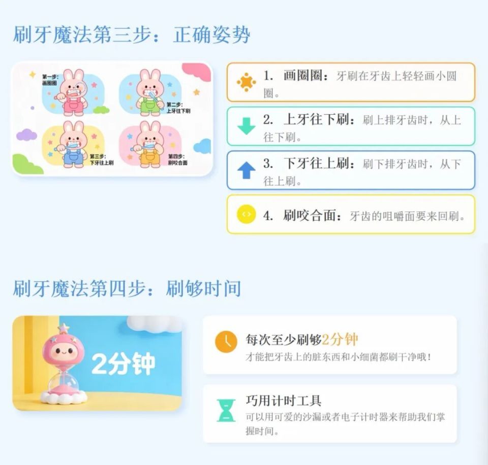 用软毛儿童牙刷和豌豆大小的牙膏,按照"画圈圈"的方法刷牙:上牙往下刷,下牙往上刷,咬合面来回刷,里里外外都要刷够2-3分钟!