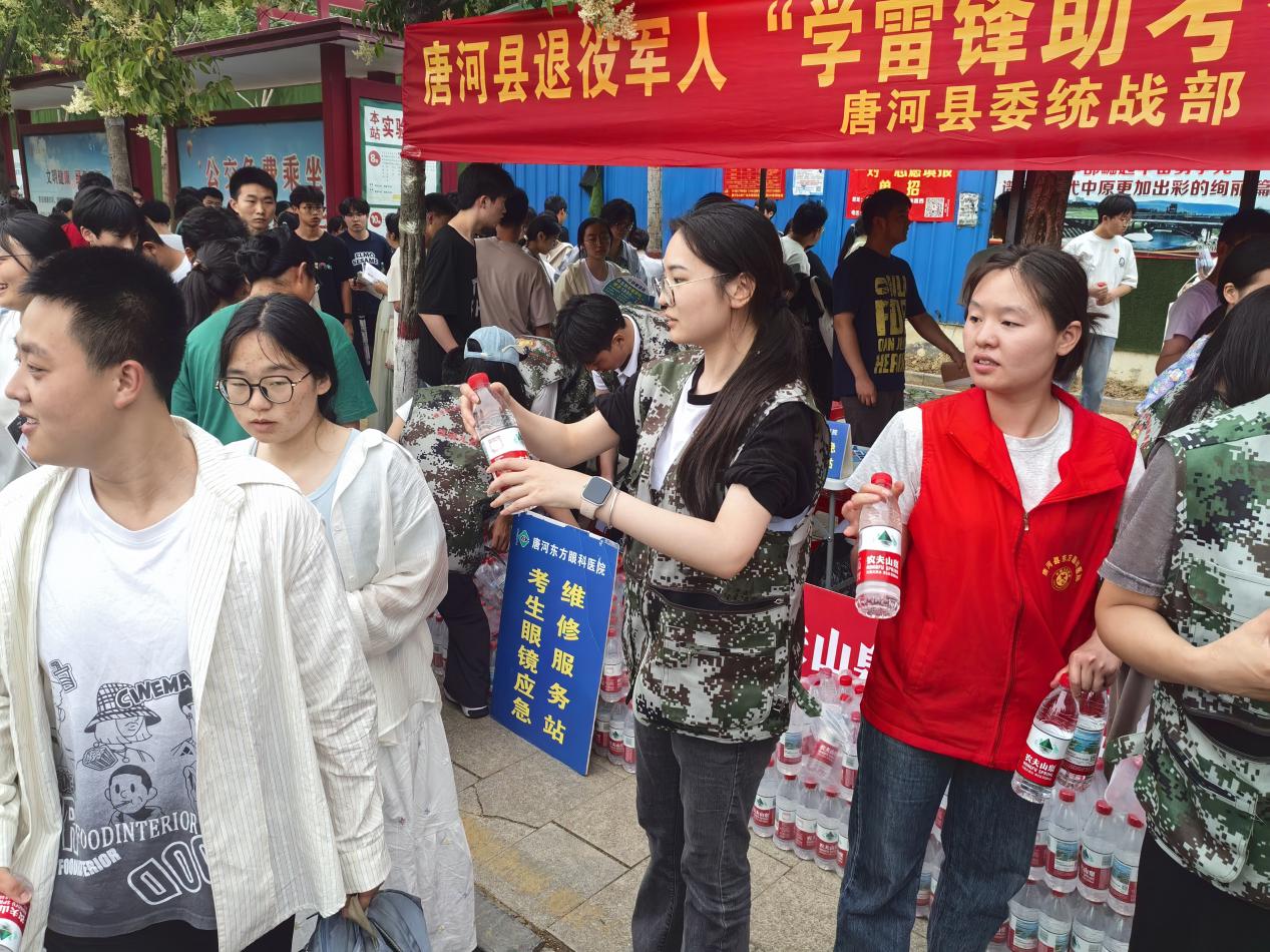 六月的风里裹着蝉鸣,也藏着少年们奔赴考场的迫切。6月7日清晨,唐河街头多了道温暖的风景——县一高中、文峰高中、友兰高中等7个考点外,遮阳棚下,蓝色的"唐河东方眼科医院眼镜应急维修服务站"的牌子格外醒目,身穿志愿者马甲的志愿者们正弯腰调试着眼镜清洗机,桌上摆着擦镜水、眼镜布、矿泉水、应急药品、扇子等,还有几摞印着"祝考生金榜题名"的小卡片。