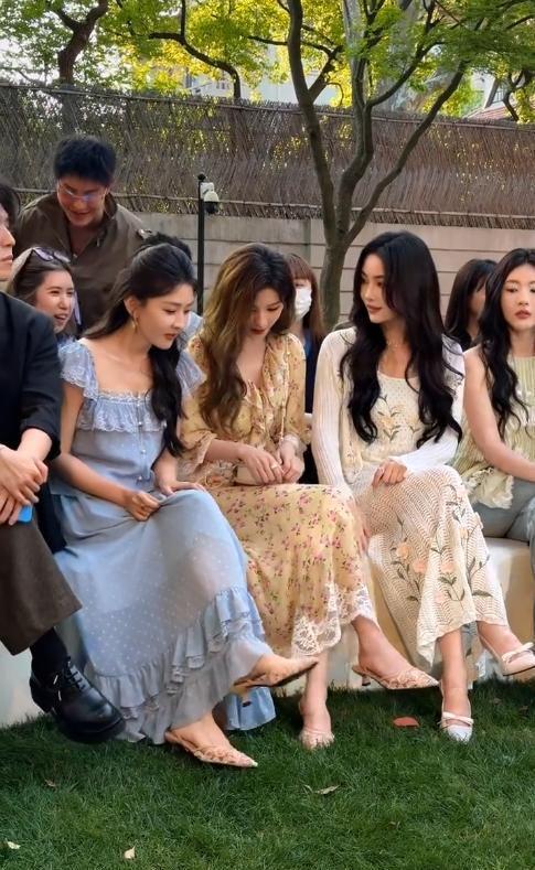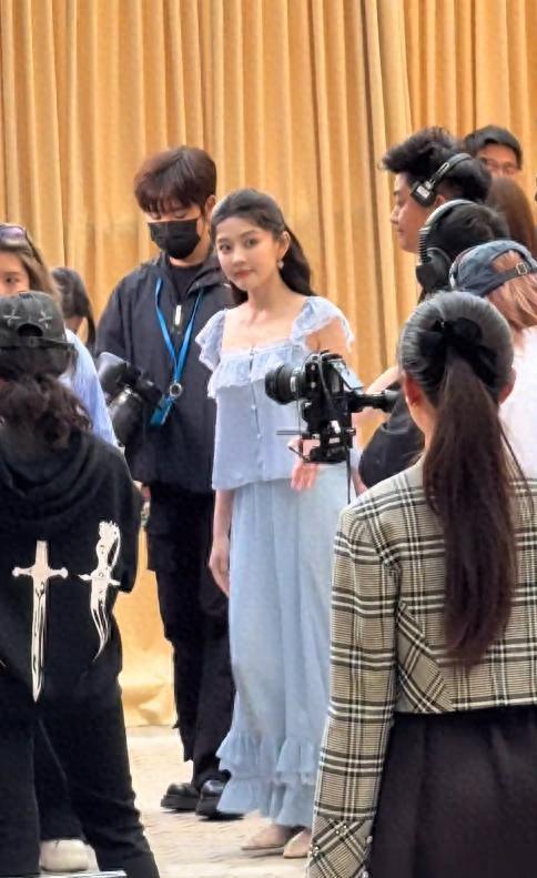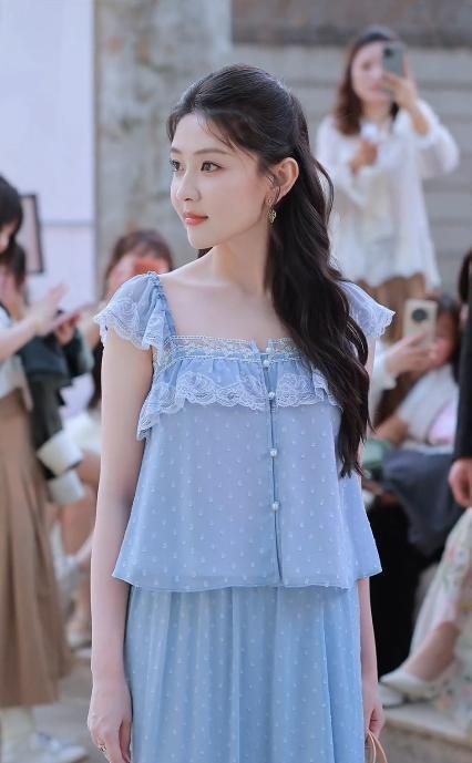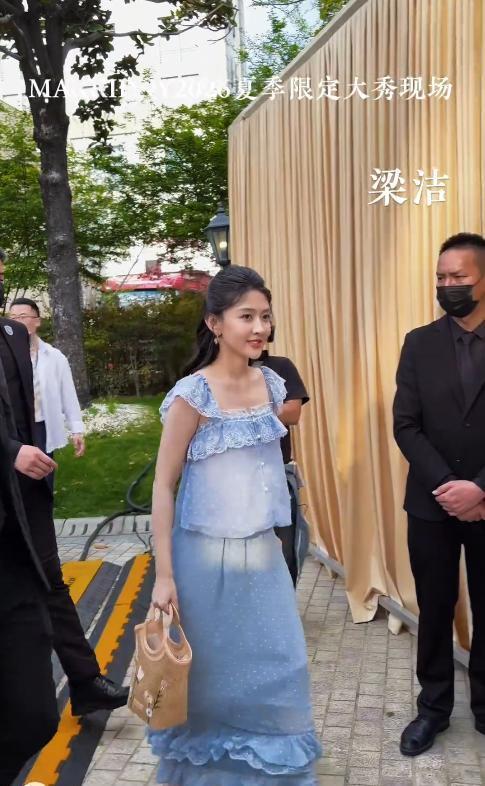 此次上海大秀现场,梁洁以一袭湖蓝色波点雪纺长裙亮相,发髻半挽、耳畔微垂几缕碎发,整体造型清爽如初夏晨风,毫无冗余修饰。
