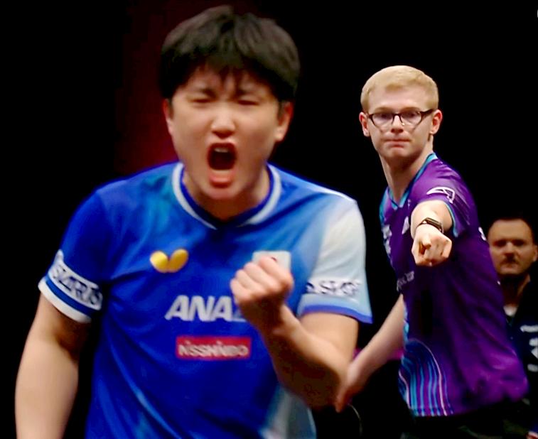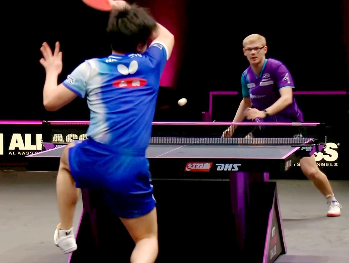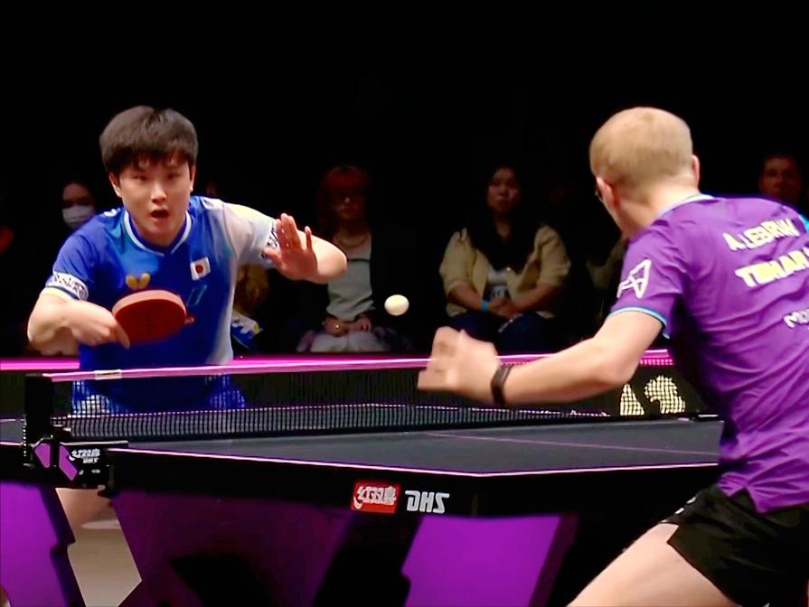 第二局小勒布伦再次开局不利0-4落后于人,紧接着开始反击试图复刻首局大逆转的好戏,但张本智和非常聪明地将争夺的焦点转移到正手相持等环节,小勒布伦的直拍打法劣势随即被放大,很快便3-10落后并最终以4-11败北,双方由此而回到同一起跑线。