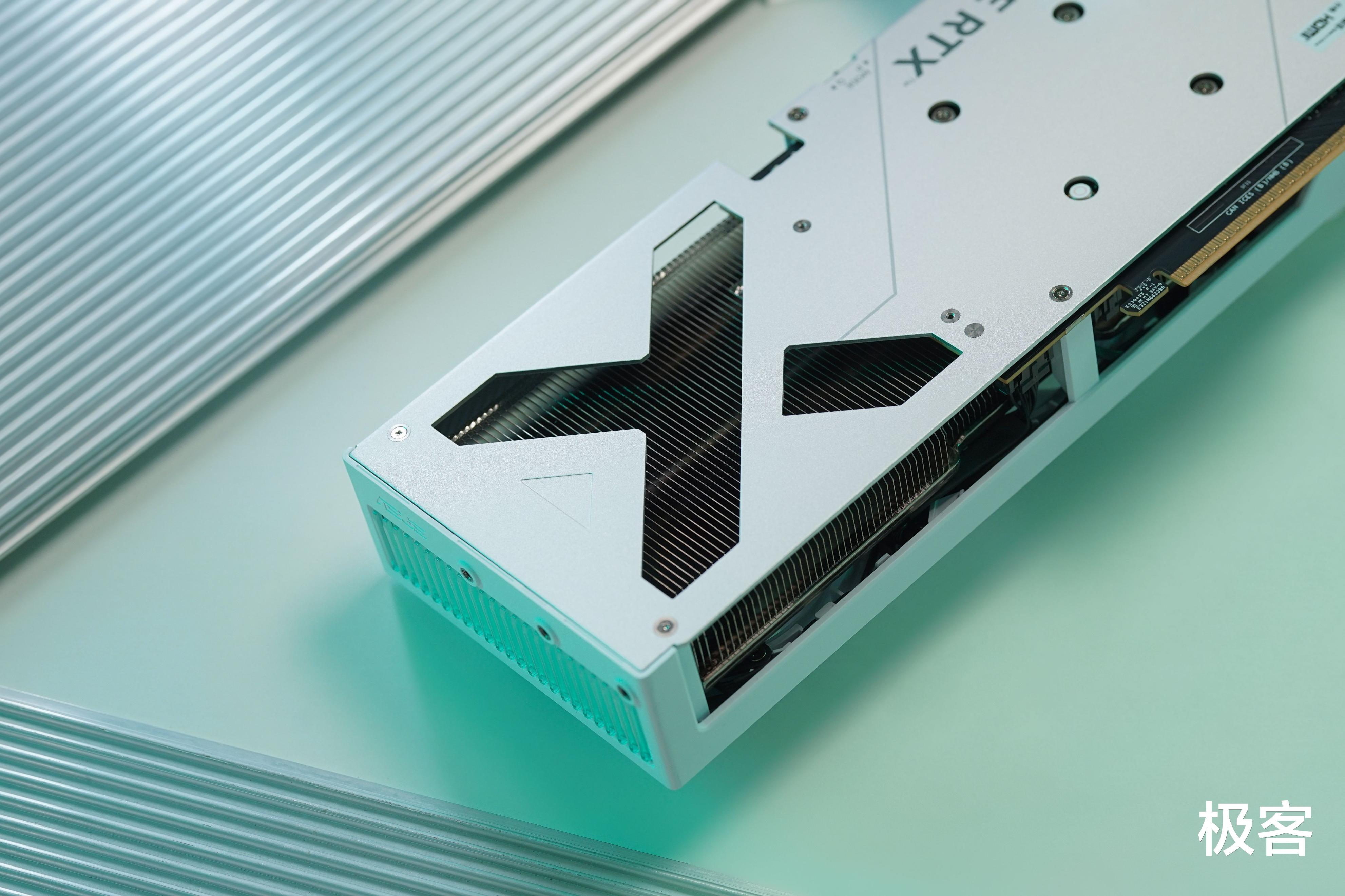 显卡的背板采用了高强度的金属设计,并在散热器片的一侧位置设计了X形状的镂空进气格栅,加快了散热效率,改善了整机的散热风道。在显卡的尾部还增加了ARGB灯条,并支持神光同步。