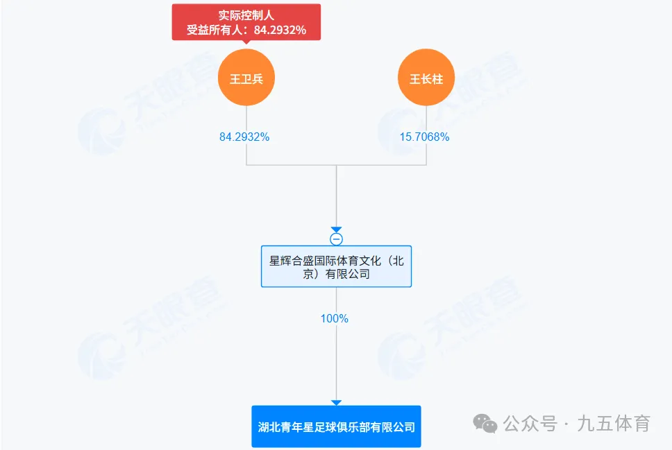 四、湖北青年星足球俱乐部该俱乐部成立于2016年7月8日,注册资本为500万元,法定代表人是崔佳玮。股权结构是星辉合盛国际体育文化(北京)有限公司持股100%,最终实际控制人是王卫兵。