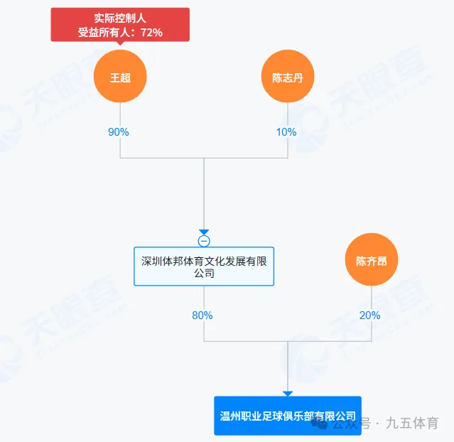 七、温州职业足球俱乐部该俱乐部成立于2020年1月10日,注册资本为500万元,法定代表人是王超。股权结构是深圳体邦体育文化发展有限公司持股80%、陈齐昂持股20%,最终实际控制人是王超。