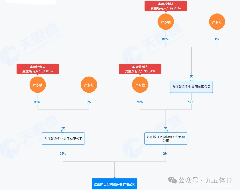 六、江西庐山足球俱乐部该俱乐部成立于2012年2月23日,注册资本为1500万元,法定代表人是芦宁江。股权结构是九江联盛实业集团有限公司持股98%、九江城开旅游投资股份有限公司持股2%,最终实际控制人是严永敏。