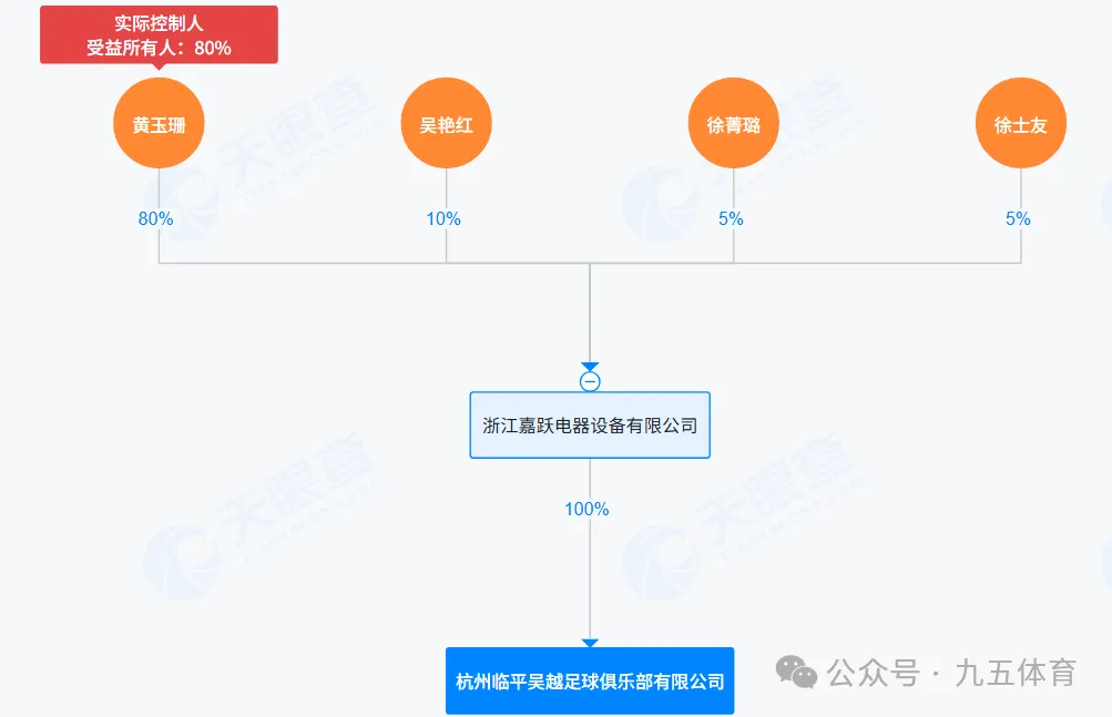 五、杭州临平吴越足球俱乐部该俱乐部成立于2022年12月21日,注册资本为10万元,法定代表人是黄旭。股权结构是浙江嘉跃电器设备有限公司持股100%,最终实际控制人是黄玉珊。