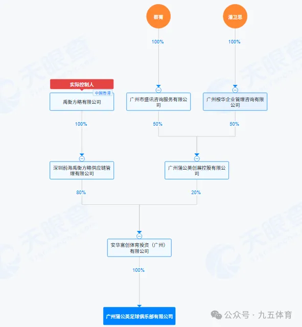 九、广州蒲公英足球俱乐部该俱乐部成立于2020年6月30日,注册资本为300万元,法定代表人是李斌。股权结构是安华富创体育投资(广州)有限公司持股100%,最终实际控制人是注册在香港的一家企业——禹衡方略有限公司。
