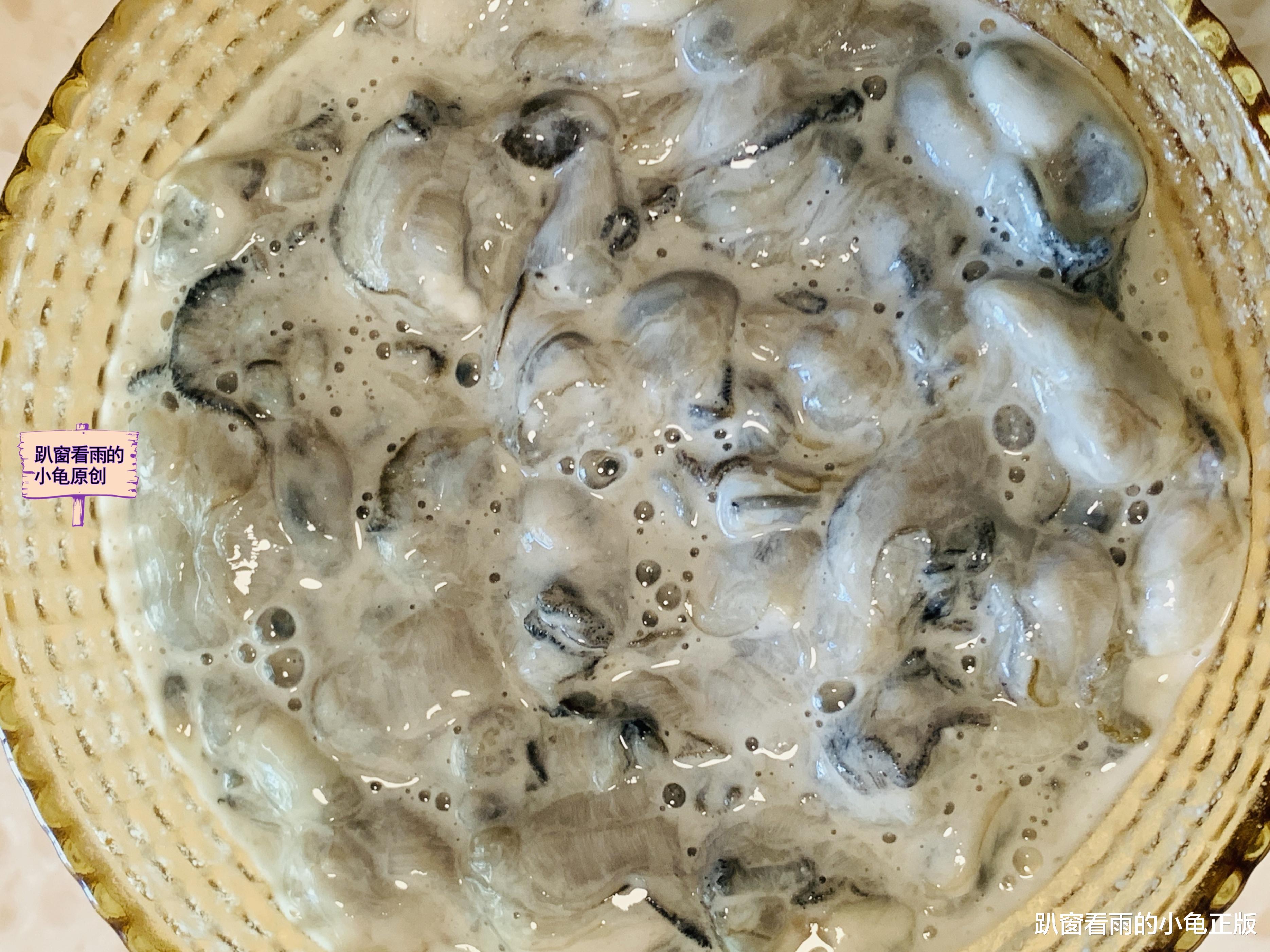 1、将海蛎肉放入带小孔的洗菜盆中或者笊篱上,用清水冲洗洗净,并沥干水分备用。(海蛎肉中免不了会带有海蛎壳等杂质,若不去掉,会影响口感。)