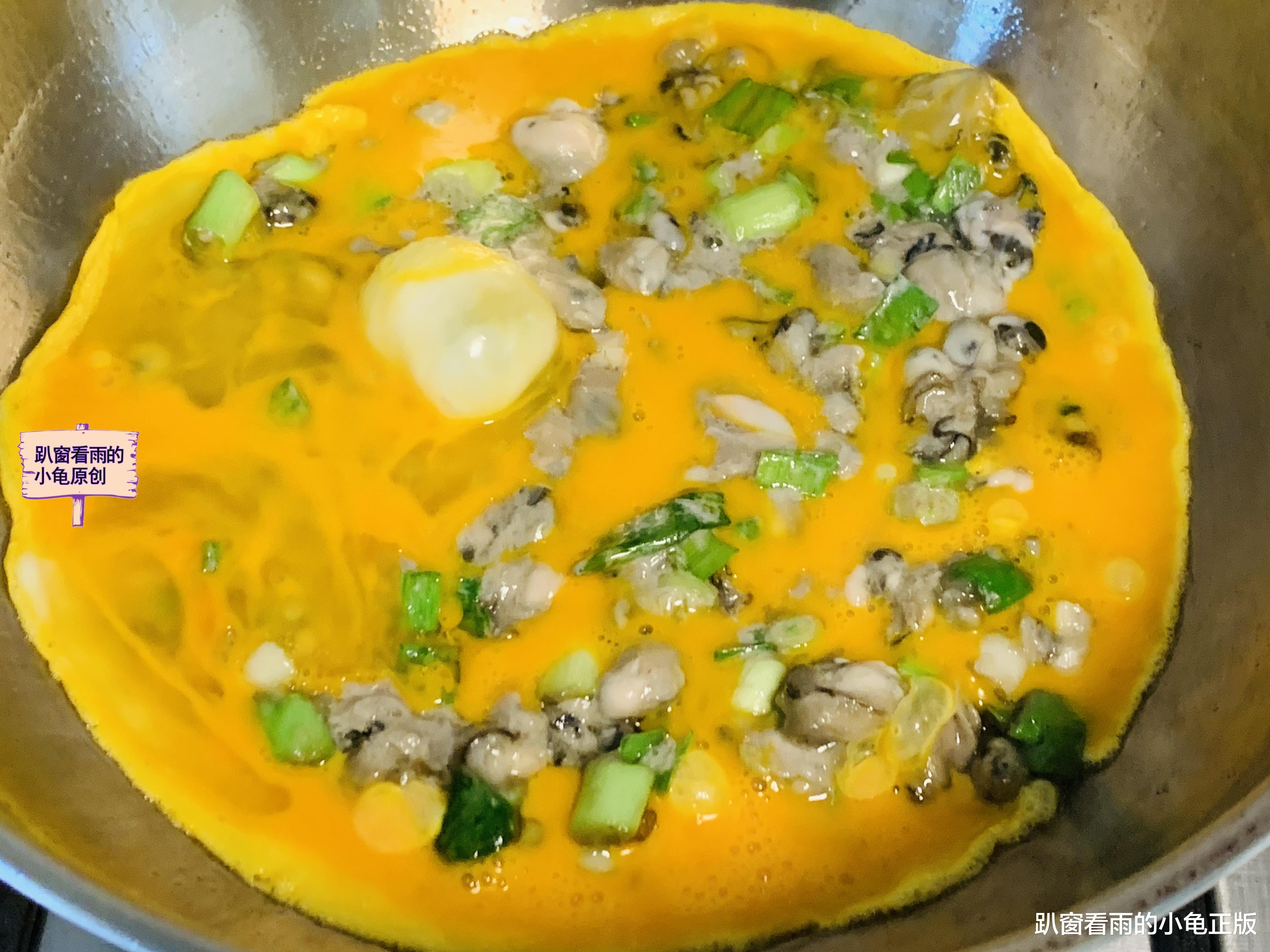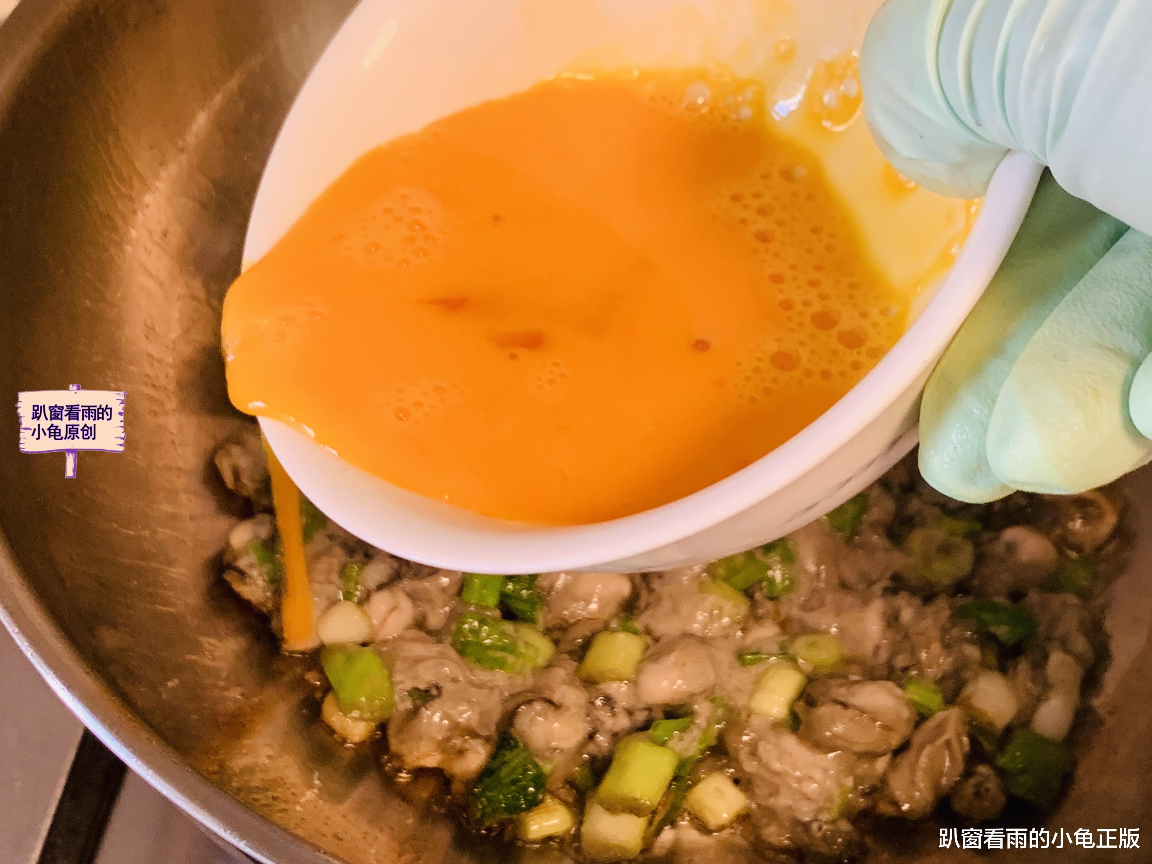 4、火上坐平底锅,锅热倒油,待油热后,将海蛎倒入锅中。用中小火慢慢煎制,一面定型后翻煎至另一面。