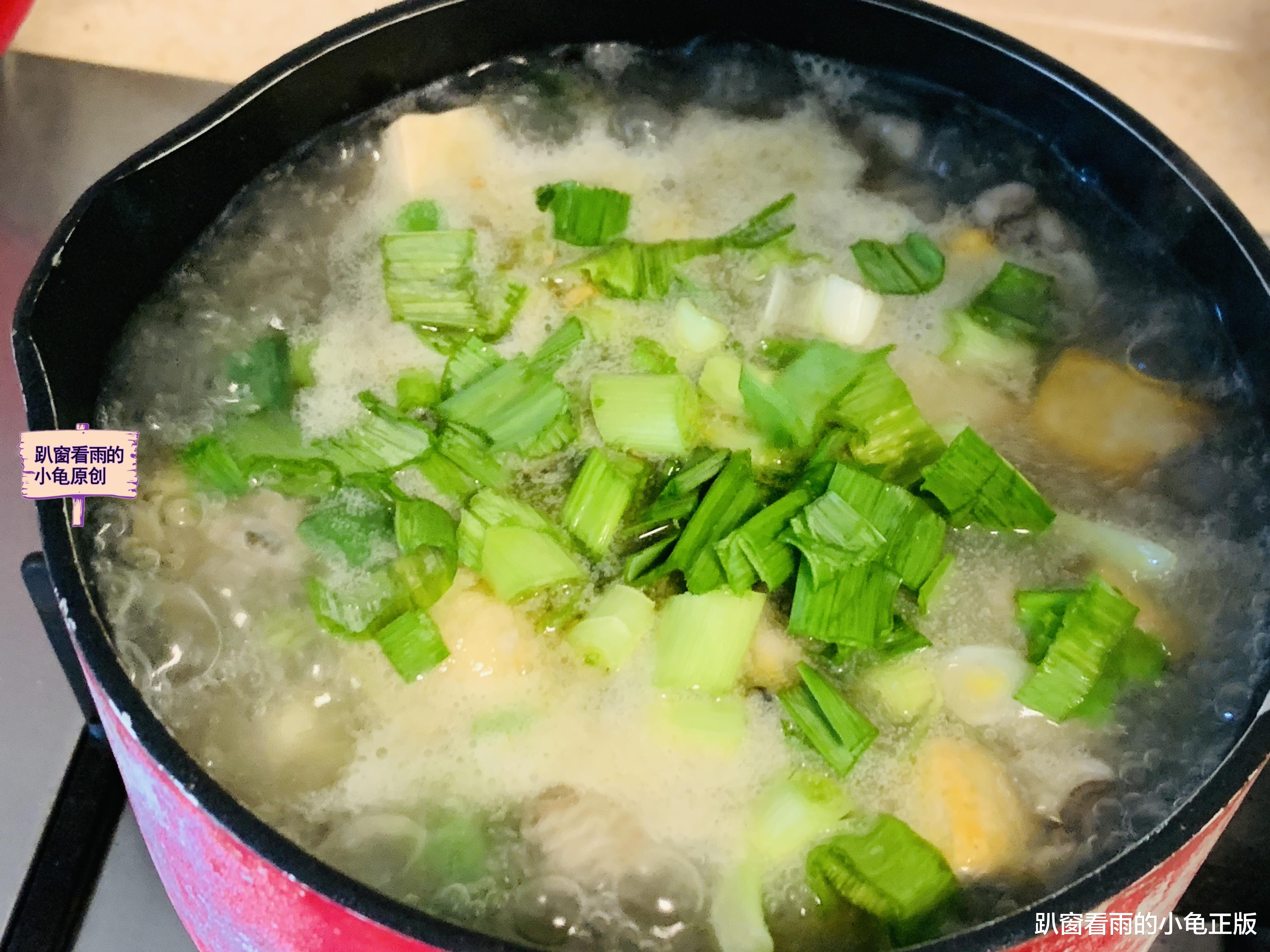 7、汤沸后,下入青蒜粒、香菜碎。再次煮开后关火即可盛出。