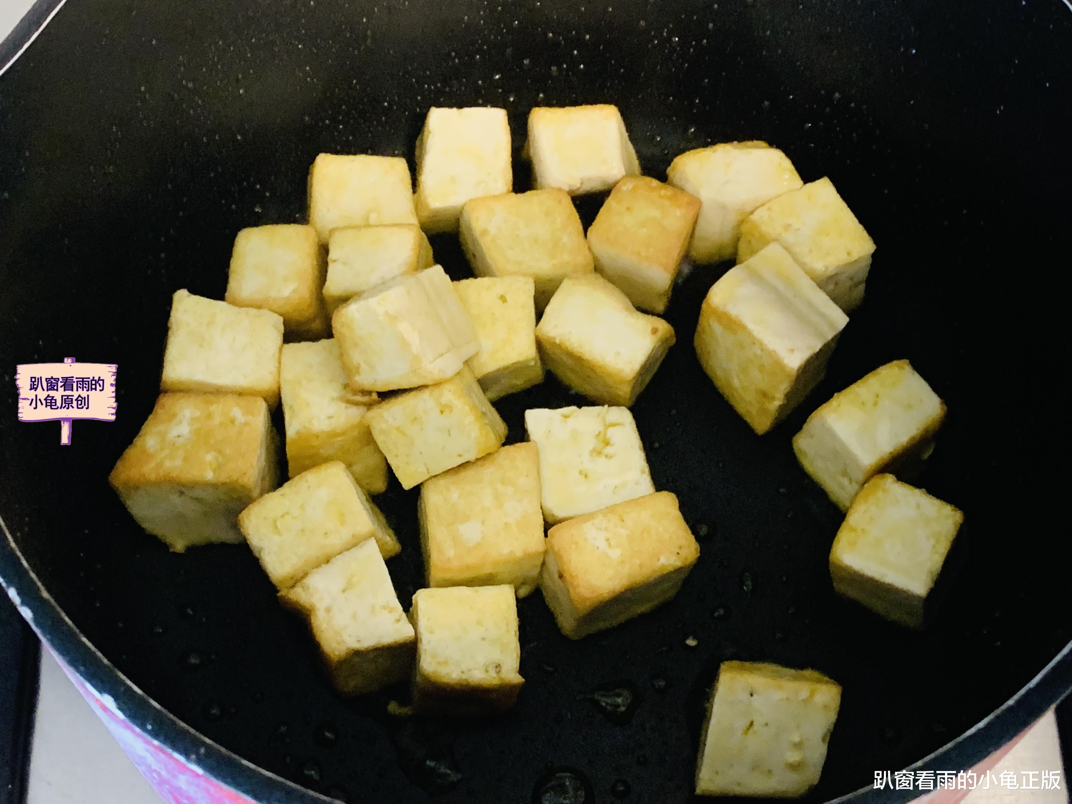 2、火上坐平底锅,锅热倒油,待油热后,将豆腐块倒入锅中,煎成金黄色,盛出备用。