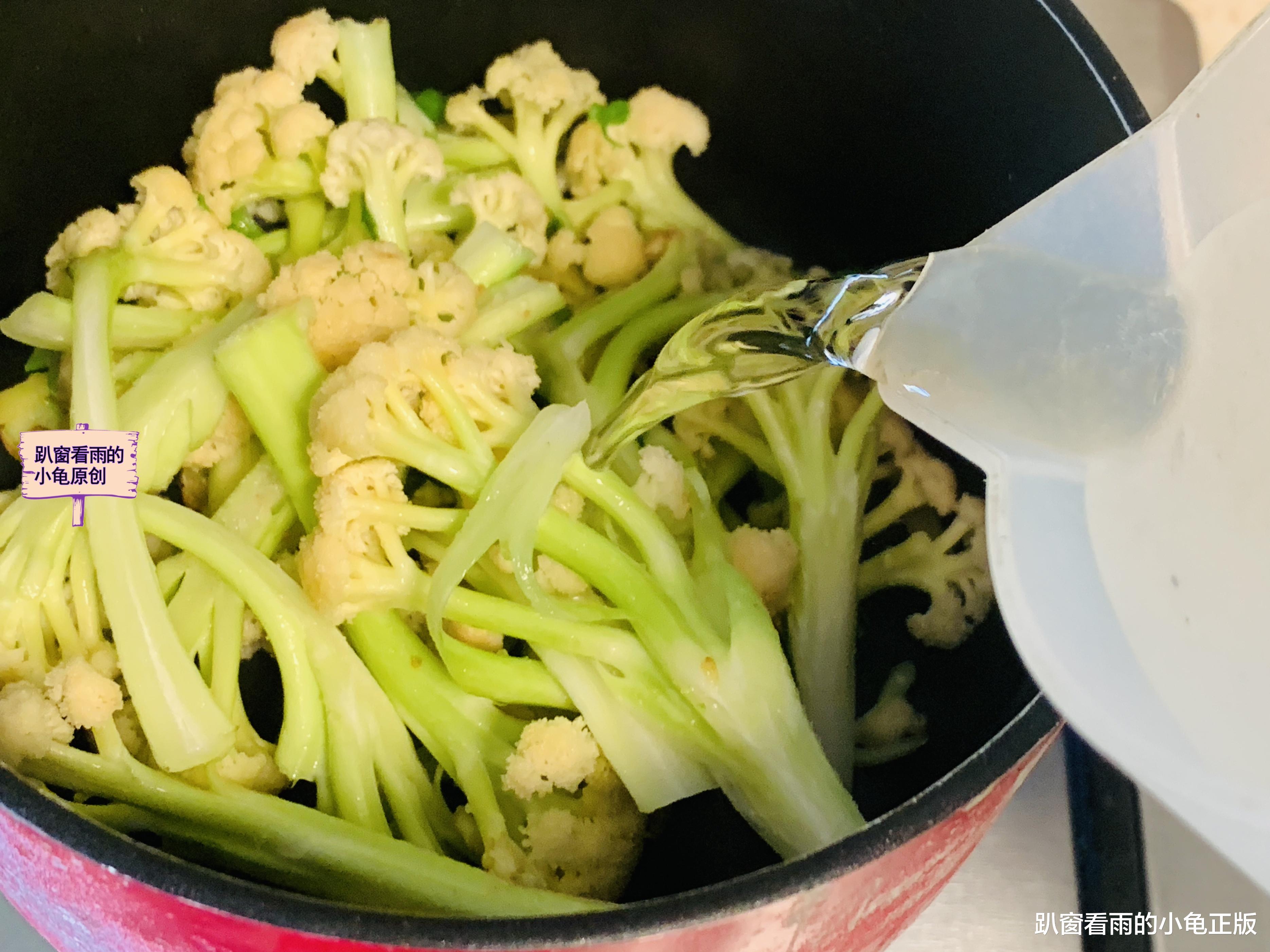 4、下入菜花,煸炒均匀后,加入适量清水,煮开。