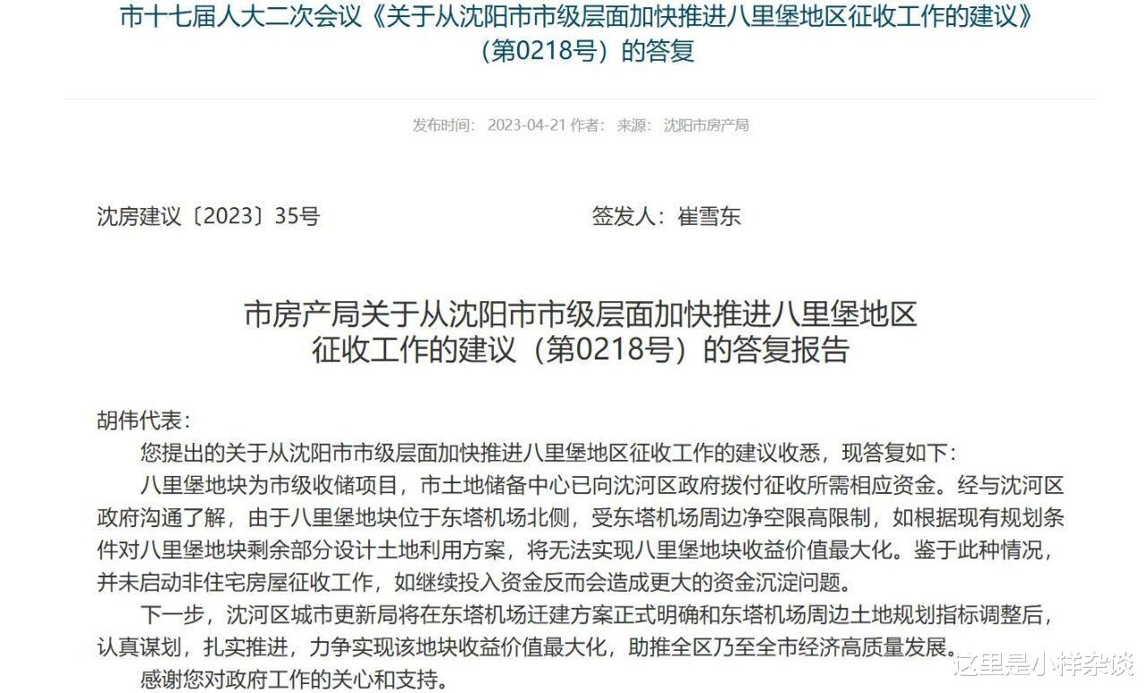 (图片来源于沈阳市房产局官网截图)沈阳市房产局关于八里堡地区动迁的回复是这样的:
