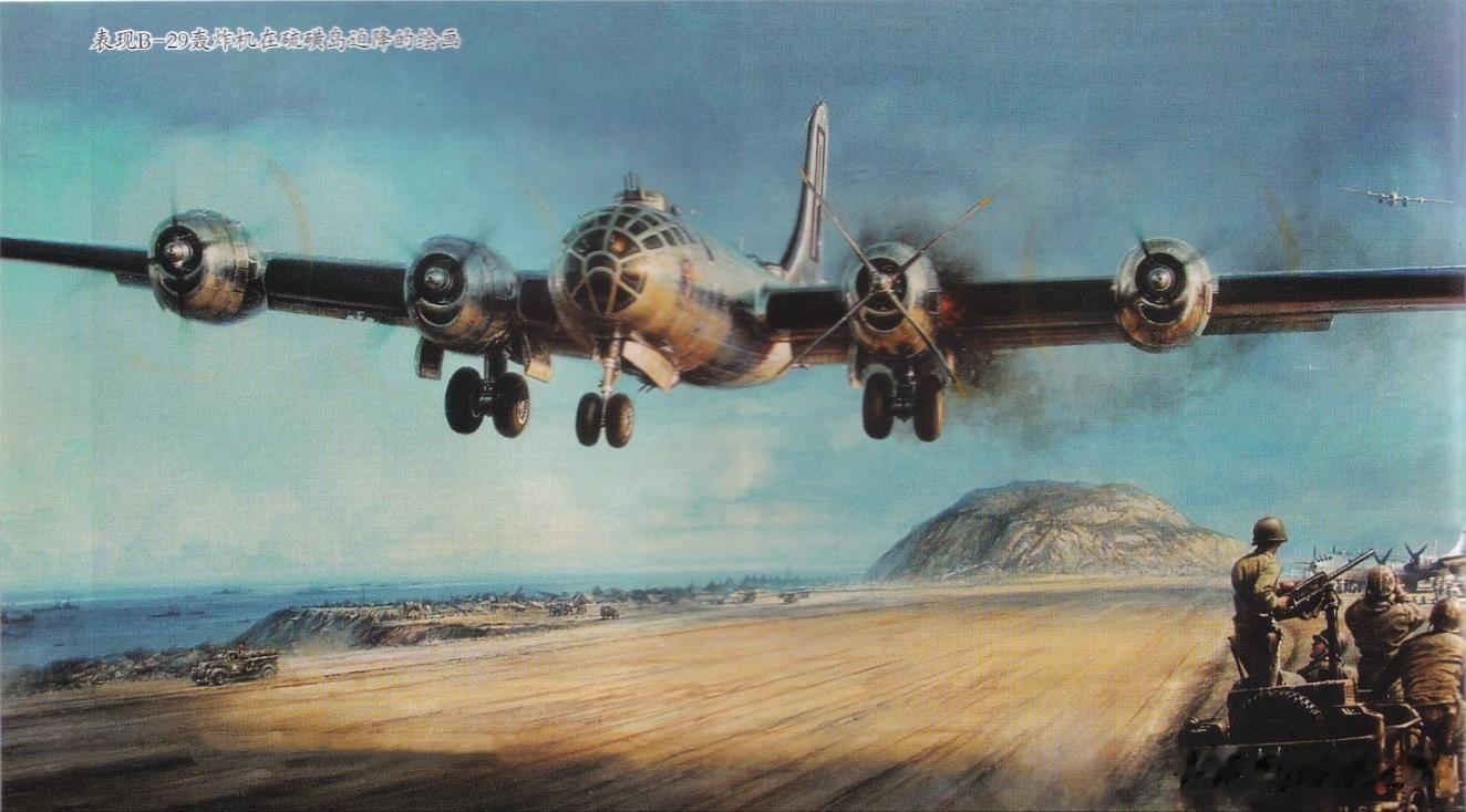 表现B-29轰炸机在硫磺岛迫降的绘画