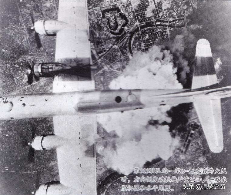 第313联队的一架B-29在轰炸大阪时,右内侧发动机舱严重漏油,一路染黑机翼和水平尾翼。