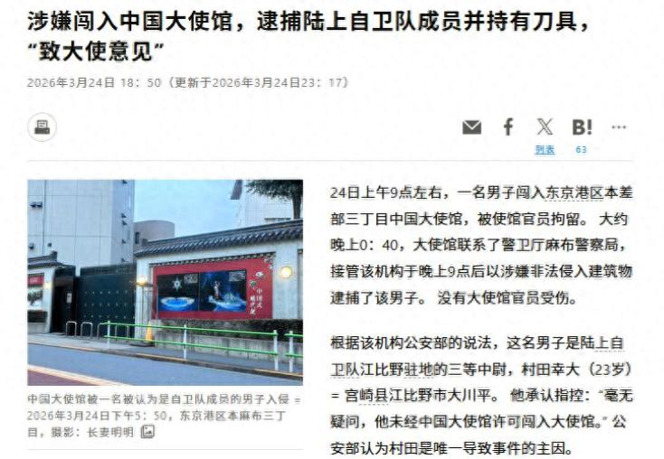 一名身份明确的日方自卫队人员,公然携带凶器翻墙闯入中方驻日大使馆,甚至扬言要杀害中方外交人员,在被现场安保人员制服后,此人对自己的刺杀图谋供认不讳,没有丝毫辩解。