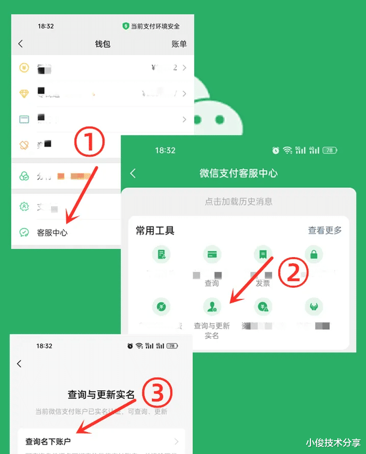 第五步,在钱包页面中,点击下面的【客服中心】第六步,在微信支付客服中心页面,点击常用工具中的“查询与更新实名”;