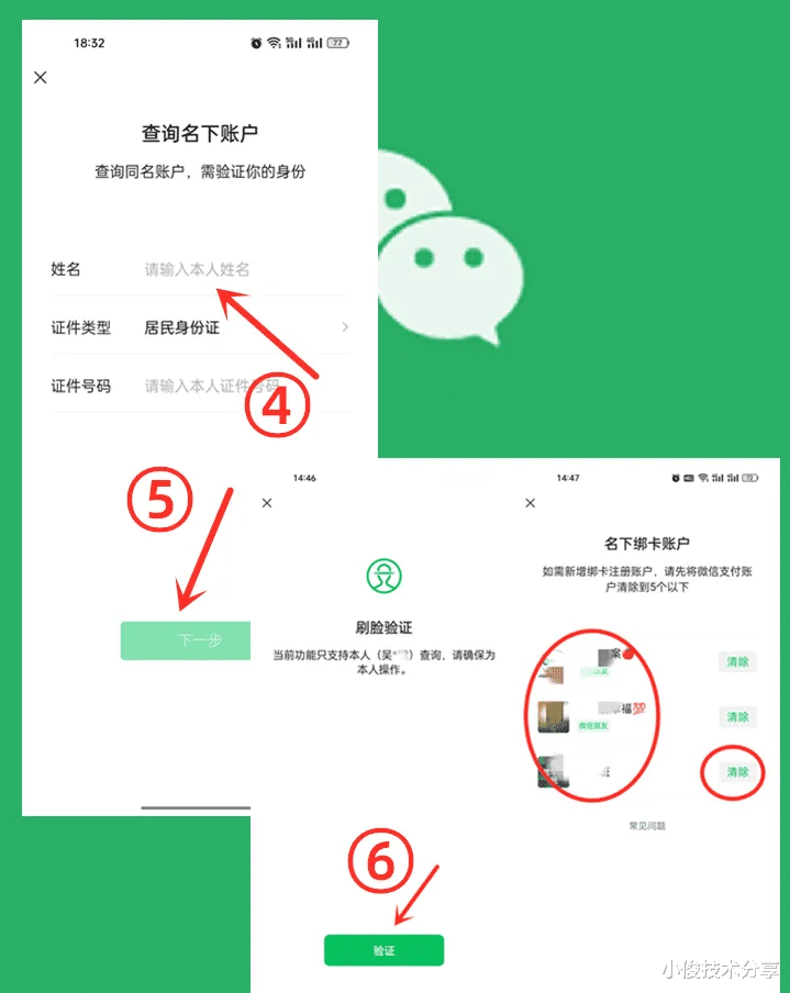 第十一步,验证通过之后,就可以看到自己名下注册了多少个微信了!如果发现这里有不是自己或家人注册的,立即点击后面的【清除】按钮,把它们清除干净!