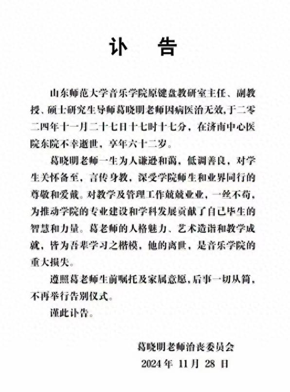 11月28日,教育圈又传来一则噩耗,山东师范大学音乐学院副教授葛晓明老师因病医治无效于2024年11月27日17时17分,在济南中心医院东院不幸逝世,享年62岁。