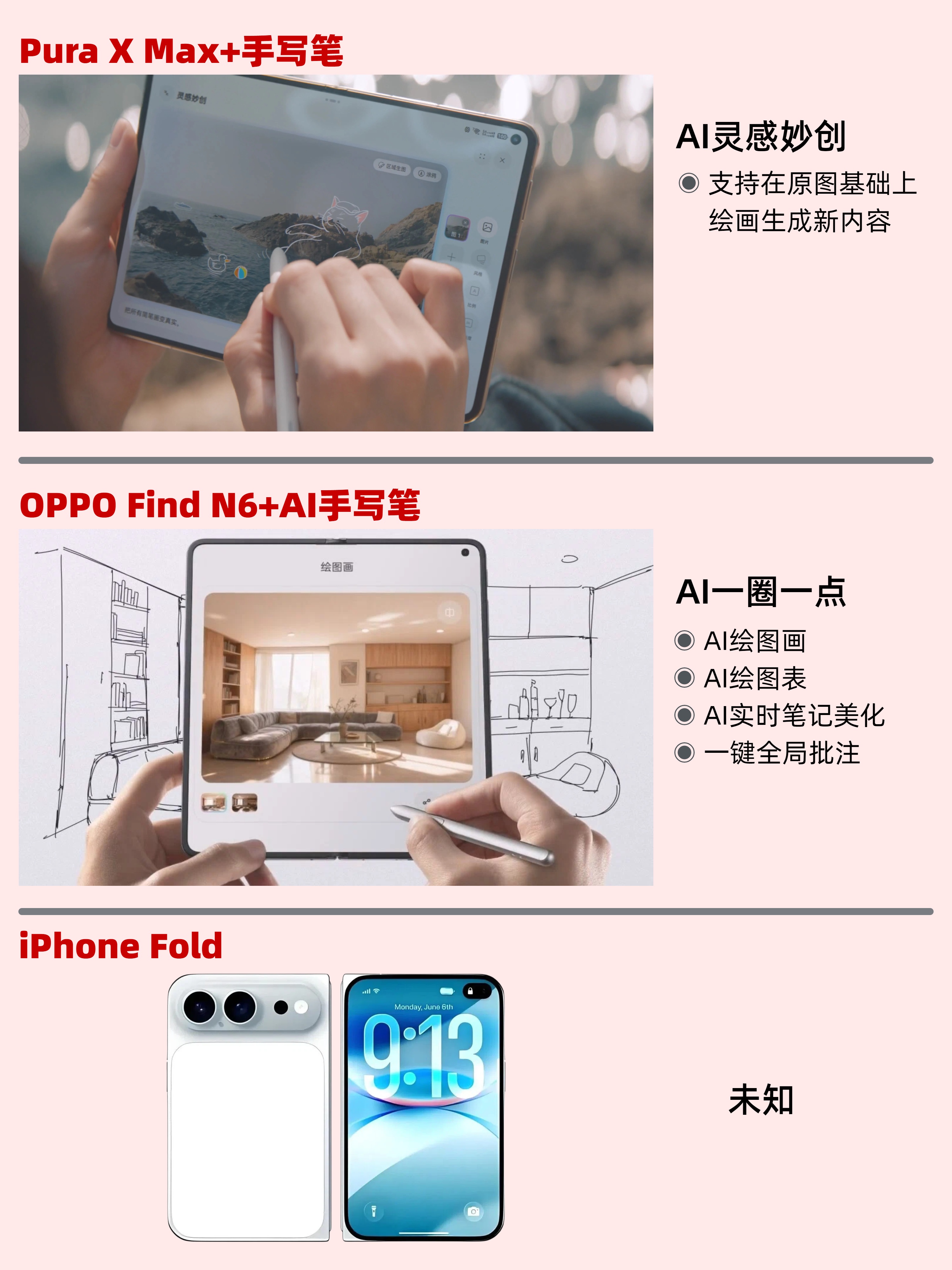 最慢的是苹果老大哥的iPhone Fold,传闻九月才来,关键我看了下怎么处处是上面内俩的影子啊?比例看着就学的Pura X Max,无折痕技术更是被曝光偷师OPPO,估计果子也就寄希望于iOS系统还能成为杀手锏了...
