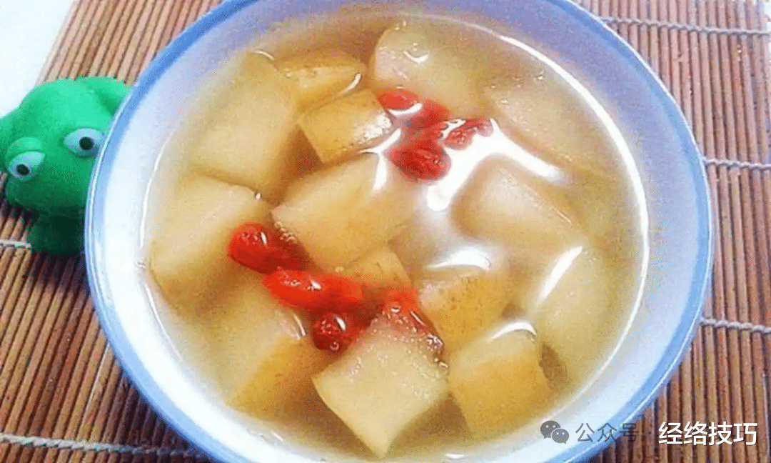 加半个雪梨还有一小把枸杞,雪梨清甜,枸杞带来一丝甘味,喝起来清甜顺口。