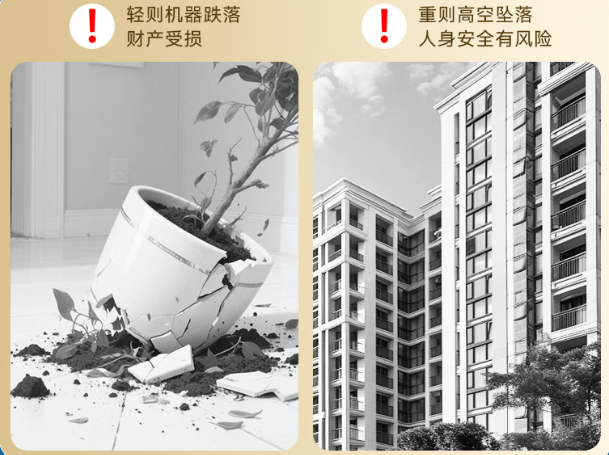内置还备用电池,在意外断电时,主机能维持吸附状态长达20-30分钟,并发出蜂鸣警报,为用户提供充足的救援时间。物理双保险:标配高强度防脱落安全绳,是最后一道安全保障。故障自检与报警:系统可检测漏气严重、电机过热等故障,并即时停止工作、发出警报。唯一不足的是对于干涸已久、粘附力强的污渍(如鸟粪、水泥点、顽固水垢),仅靠机器人的压力和普通清洁液可能无法一次清除,需要人工预先处理。